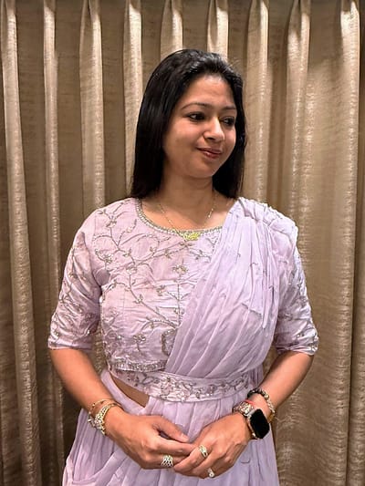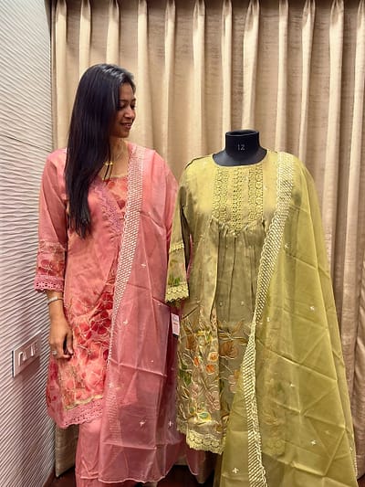 ₹3,400.00 – ₹4,000.00Price range: ₹3,400.00 through ₹4,000.00LAVENDERLavender-toned saree ensemble: • Blouse: A half-sleeved lavender blouse heavily adorned with silver floral embroidery throughout.• Saree: A pre-draped, pleated saree in a matching light lavender shadefeaturing a coordinated embroidered belt at the waist to secure the look.ORANGE ANARKALI FULL SUIT