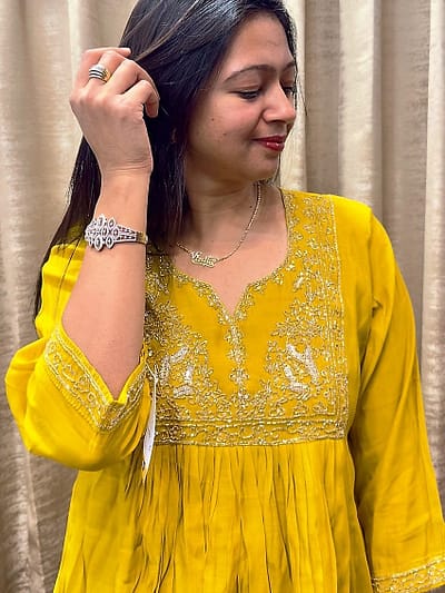 ₹3,350.00Original price was: ₹3,350.00.₹2,847.00Current price is: ₹2,847.00.MUSTARD YELLOWSuit set comes in a rich,vibrant mustard yellow hue.The straight-cut kurta features an intricate, colorful trendy enhance handwork yoke around the neckline. The sleeves are three-quarter length with a stylish,slightly flared cuff,mirroring the embroidery detail. The set is completed with a sheer dupatta that adds a touch of grace. This festive piece is perfect for adding a bright,sophisticated pop of color to any event.BEIGE GOLD PLEATED SKIRT WITH HEAVY JACKET