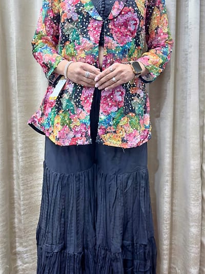₹1,800.00MULTI COLORA vibrant multi-colored floral jacket featuring shades of pink,yellow and green layered over a black top and matching black tiered wide-leg trousers(sharara).Fabric: pure chinon georgette with silk material crop top.ROSE PINK/GREEN/GREY FULL SUIT