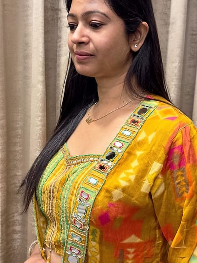 ₹4,320.00BROWN GOLDENMustard gold colored made a shiny,flowy fabric likely silk satin with embellishments abstract flowers made by bead & silver sequin tassels with matching fabricMustard yellow blend soft silk Intricately block-printed yoke Subtle mirror work Tapered straight pant with Multi-toned ethnic motif dupatta