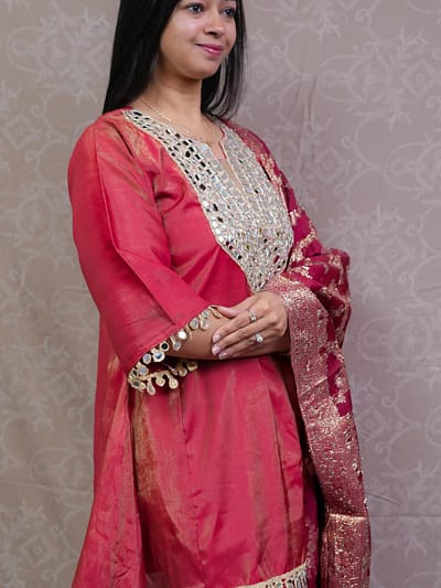 ₹3,700.00ORANGEShine bright in this vibrant Orange Shimmer Ethnic Wear set. Featuring a beautifully designed kurta, matching palazzo, and coordinating dupatta, this ensemble brings a perfect blend of festive elegance and modern style. The subtle shimmer adds a radiant glow, making it ideal for celebrations and special occasions.RED SHIMMER ETHNIC FULL SUIT