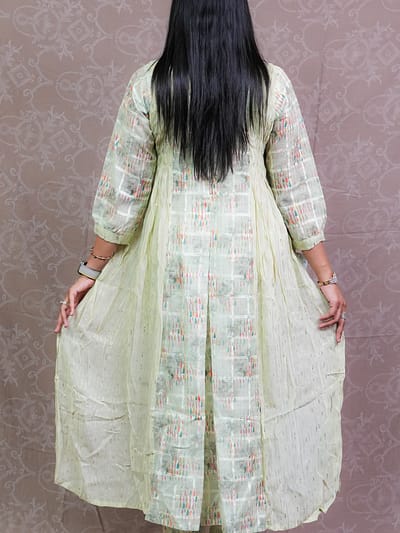 ₹2,860.00MINT GREENA stylish fusion of tradition and modernity, this Green Hi-Low Pattern Kurta Set features a flattering hi-low hemline, offering both comfort and elegance. Made from soft, breathable fabric, it comes with matching pants or leggings. Perfect for casual or semi-formal occasions, it combines ease with a chic, contemporary vibe.MULTI COLOUR JACKET WITH PLAZZO & CROP TOP
