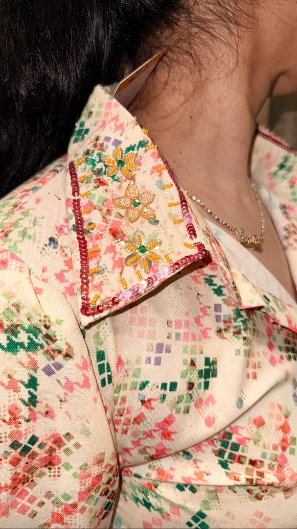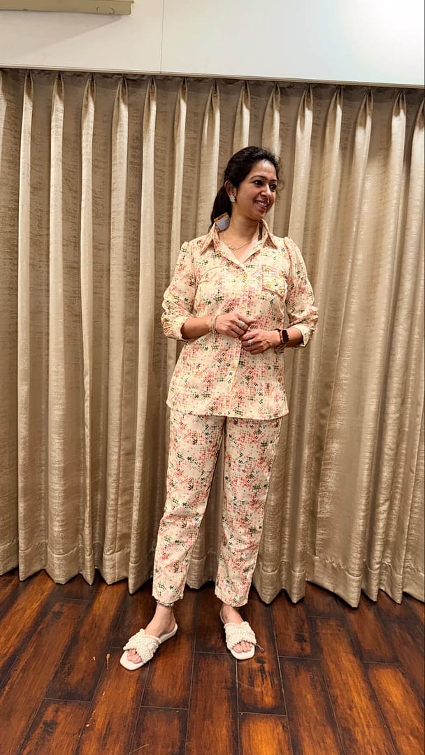 Base tone of off white Relaxed-fit button-down shirt with elegant work on pocket & collar with Straight-fit pant