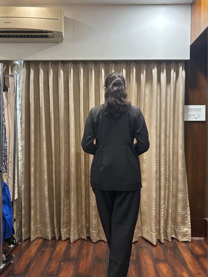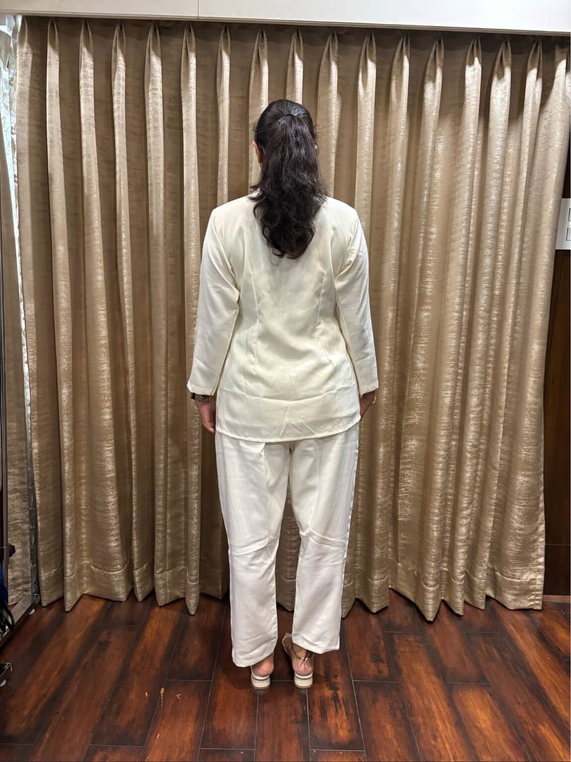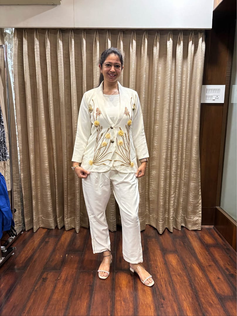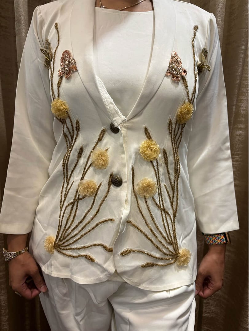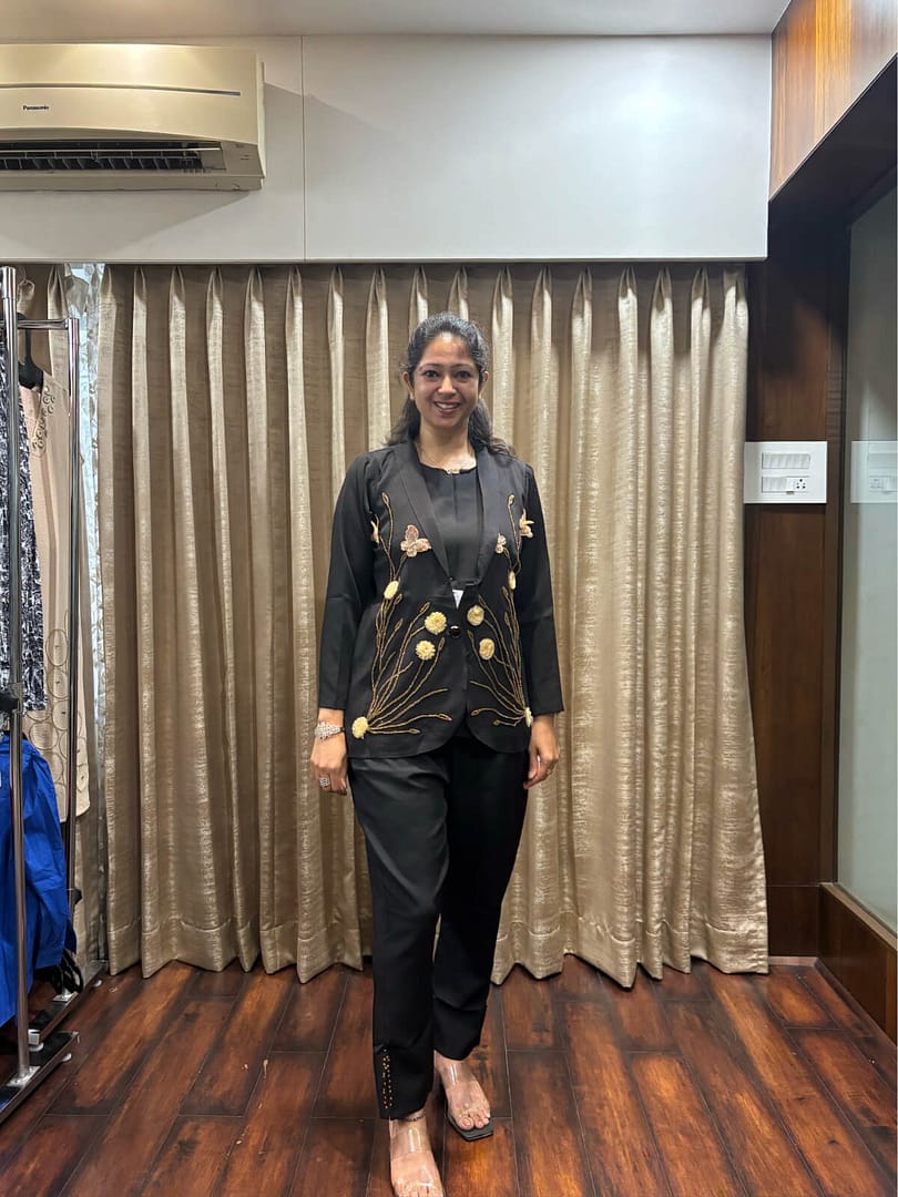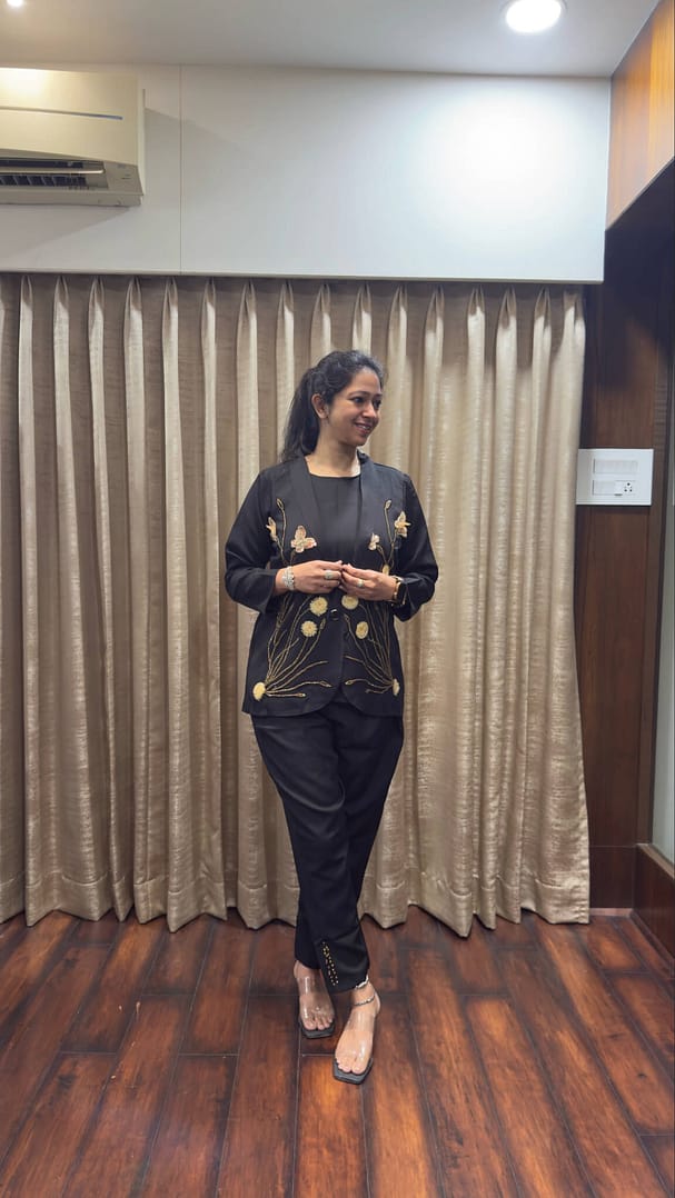 Stunning black co-ord structured blazer style with matching straight cut trousers .blazer adorned with delicate golden firming & butterfly motifs