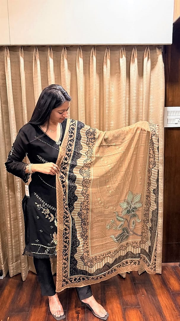 Stylish black ethnic suit with elaborate silver and gold detailing.