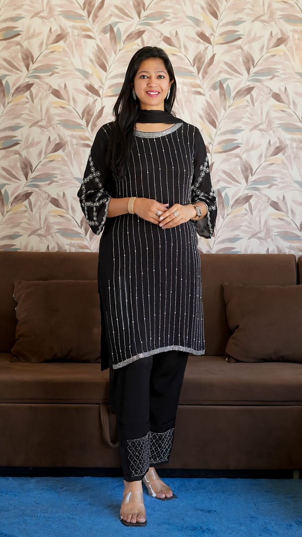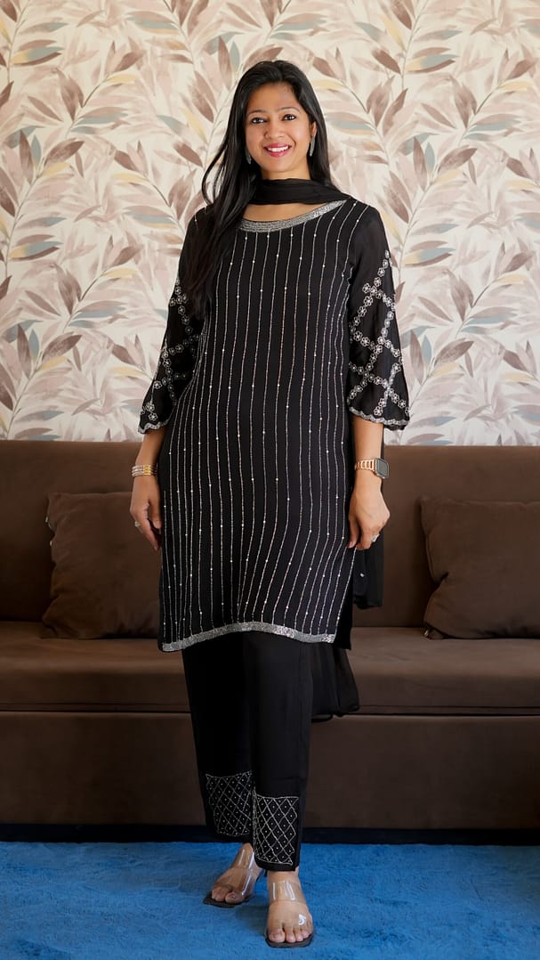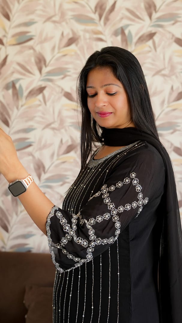 Make a statement with this stunning black full suit adorned with intricate silver work, designed for a perfect blend of elegance and sophistication. The classic black base is beautifully enhanced with detailed silver embellishments, adding a touch of glamour and refinement. Ideal for festive occasions and evening events, this outfit ensures you stand out with effortless grace.