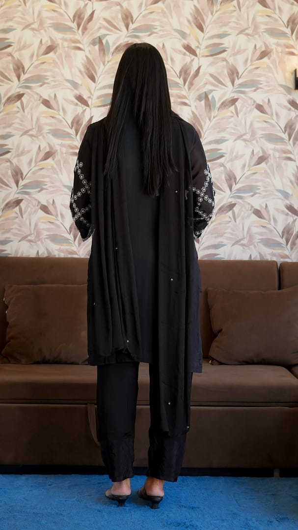 Elegant black full suit with intricate silver work, perfect for a timeless festive look.