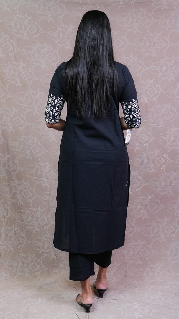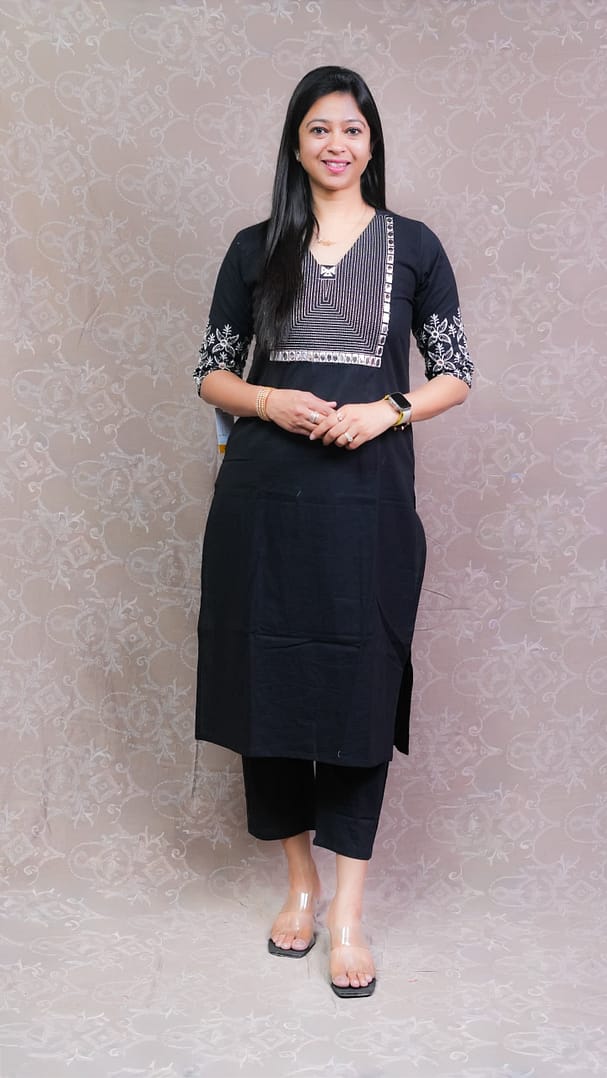 Elevate your ethnic wardrobe with this striking Black-White Mirror Kurta Set. Featuring sparkling mirror work on a classic black-and-white base, this set effortlessly blends traditional charm with contemporary style, perfect for festive and special occasions.