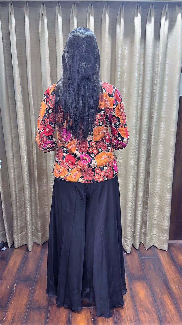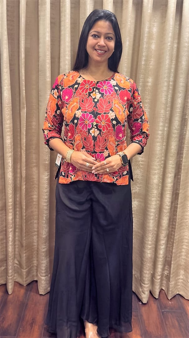 • A black, hip-length tunic with three-quarter sleeves,covered in vibrant orange, pink and red floral intricate work.It features a round neckline and small buttons down the front.•Bottom: Solid black pure chinon flowy wide-leg palazzo pants that provide a clean contrast to the detailed top.