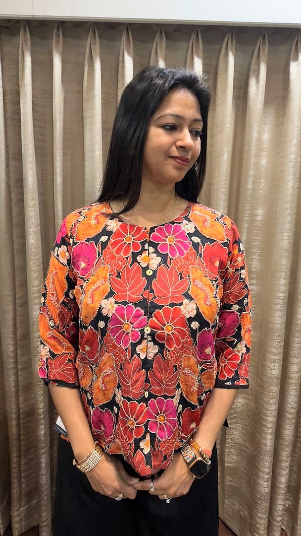 • A black, hip-length tunic with three-quarter sleeves,covered in vibrant orange, pink and red floral intricate work.It features a round neckline and small buttons down the front.