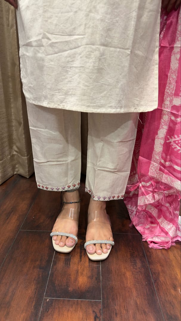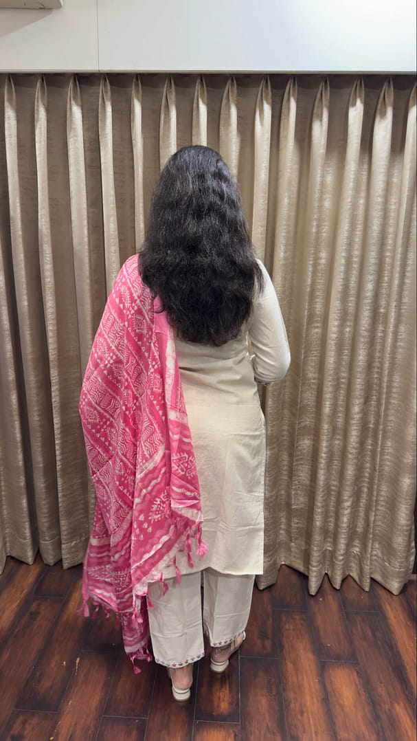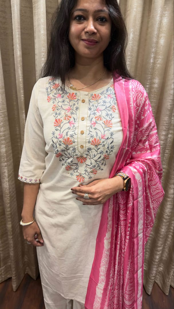 Cream-colored kurta set with delicate floral embroidery on the front in pastel shades of pink, orange, and blue with straight cream pants work on hem with bright pink woven dupatta