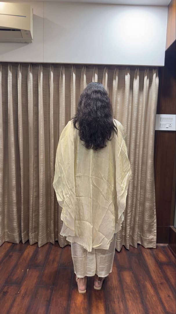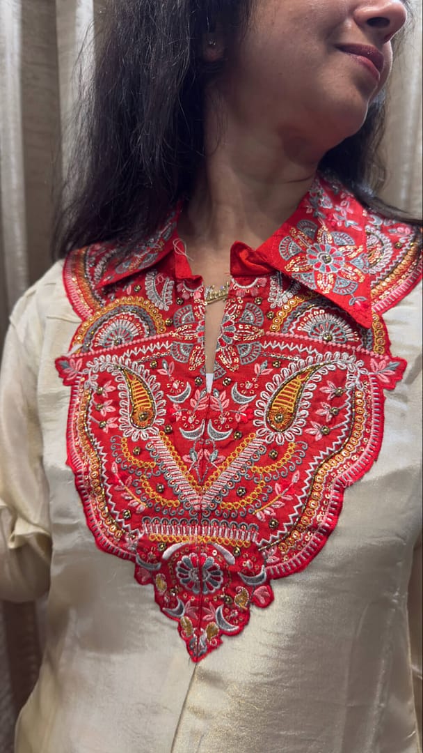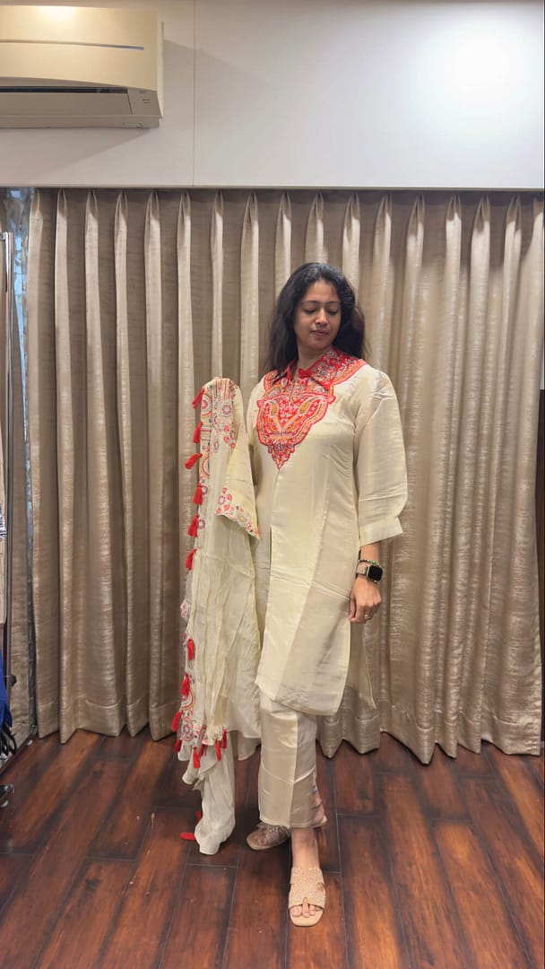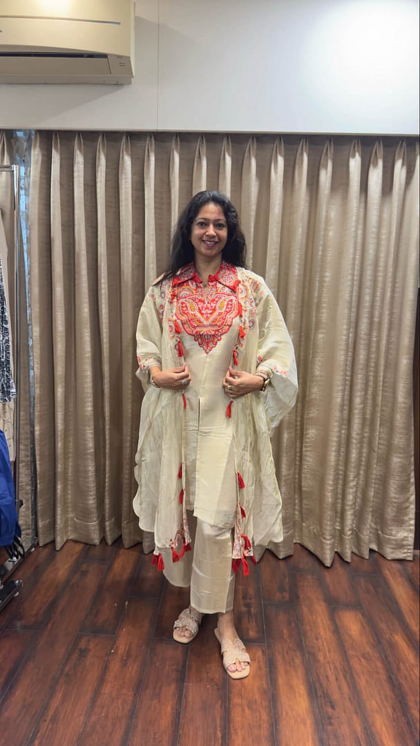 Elegant cream silk paired with cape style jacket with vibrant red work paisley motif kurta involve tassels & same matching bottom