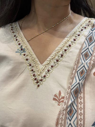 The kurta has a nice,gentle flair and is covered in simple,colorful embroidered flowers all over the front.Small yellow, orange & red details that really pop against the dark blue fabric. It’s a perfect outfit for wearing every day or for a casual gathering.