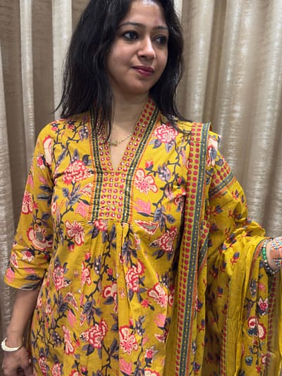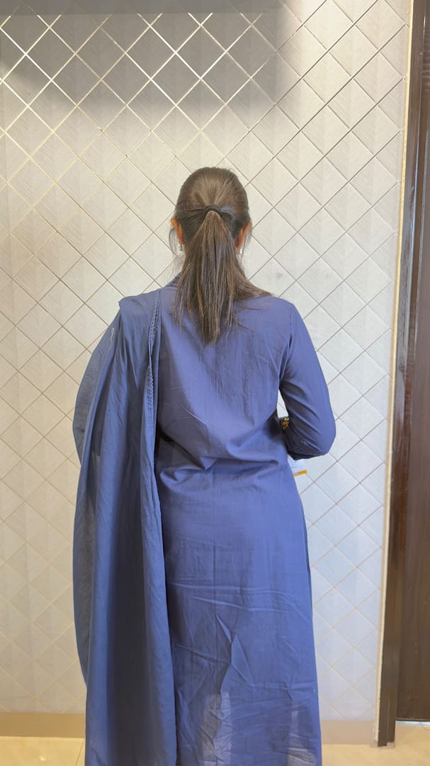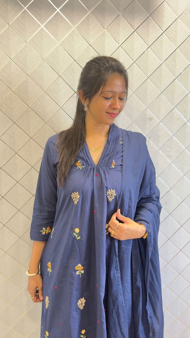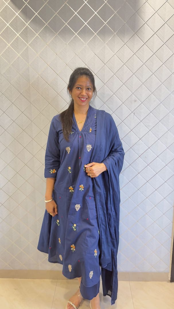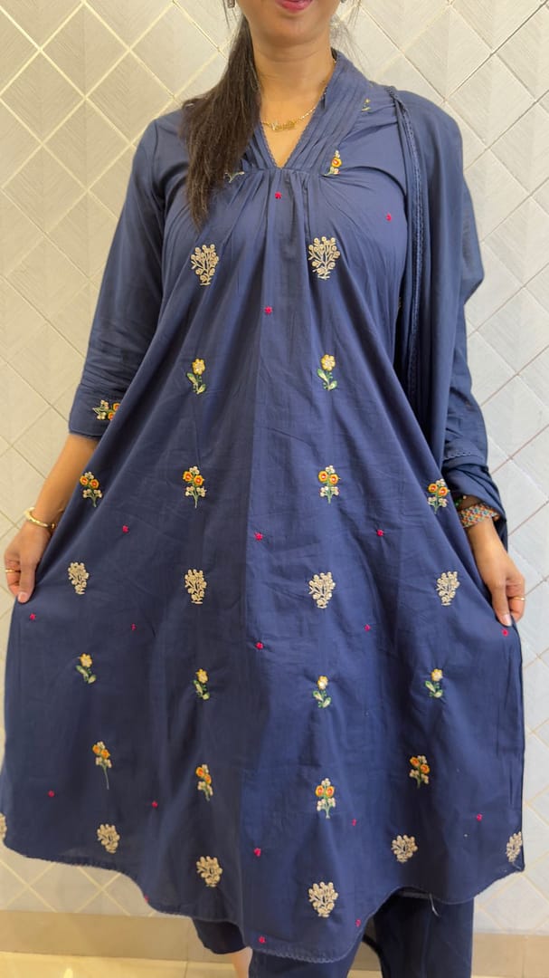 Dark blue suit set that is very comfortable and easy to wear. The kurta has a nice,gentle flair and is covered in simple,colorful embroidered flowers all over the front.Small yellow, orange & red details that really pop against the dark blue fabric. It's a perfect outfit for wearing every day or for a casual gathering.