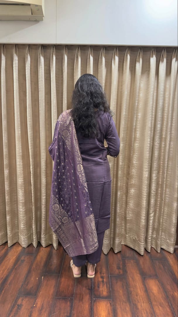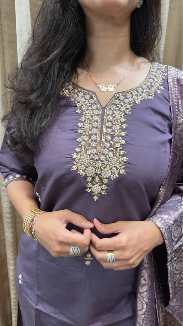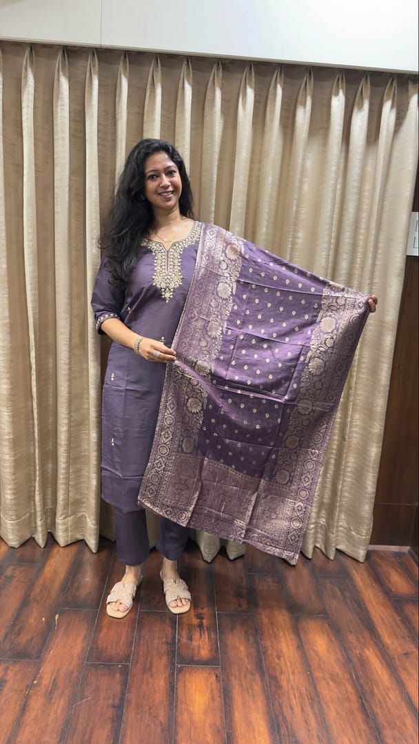 Elegant Purple silk blend fabric with beautiful thread & zari embroidery on neckline. Pant silk blend straight pant with banarsi silk dupatta rich woven zari border & buti