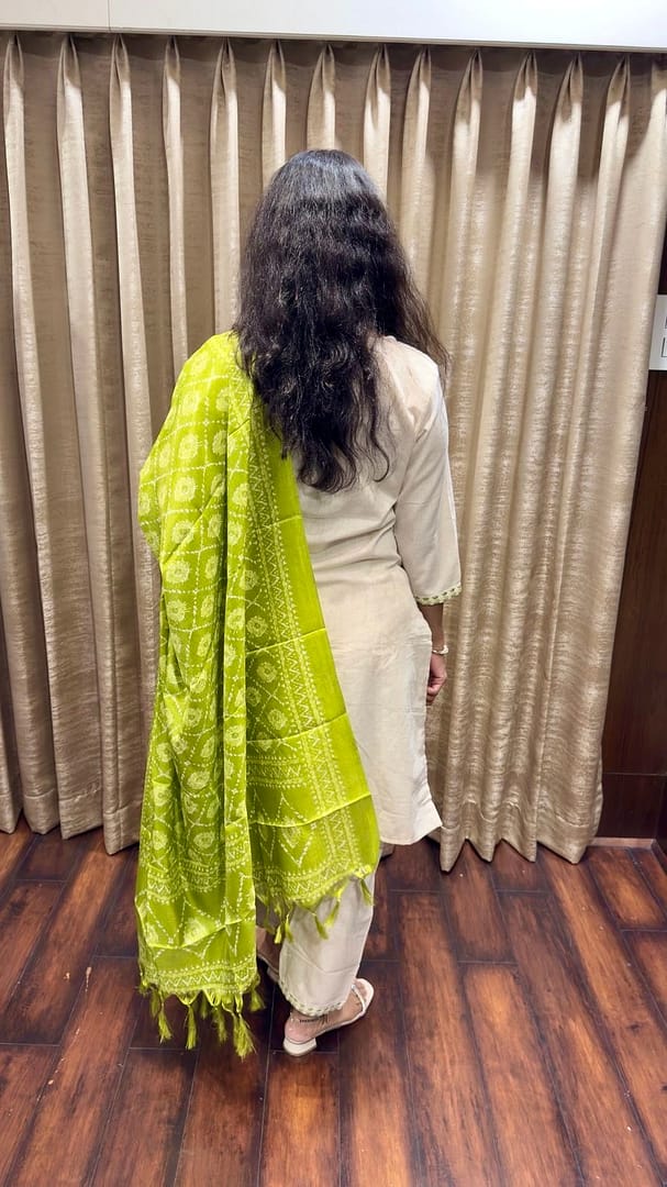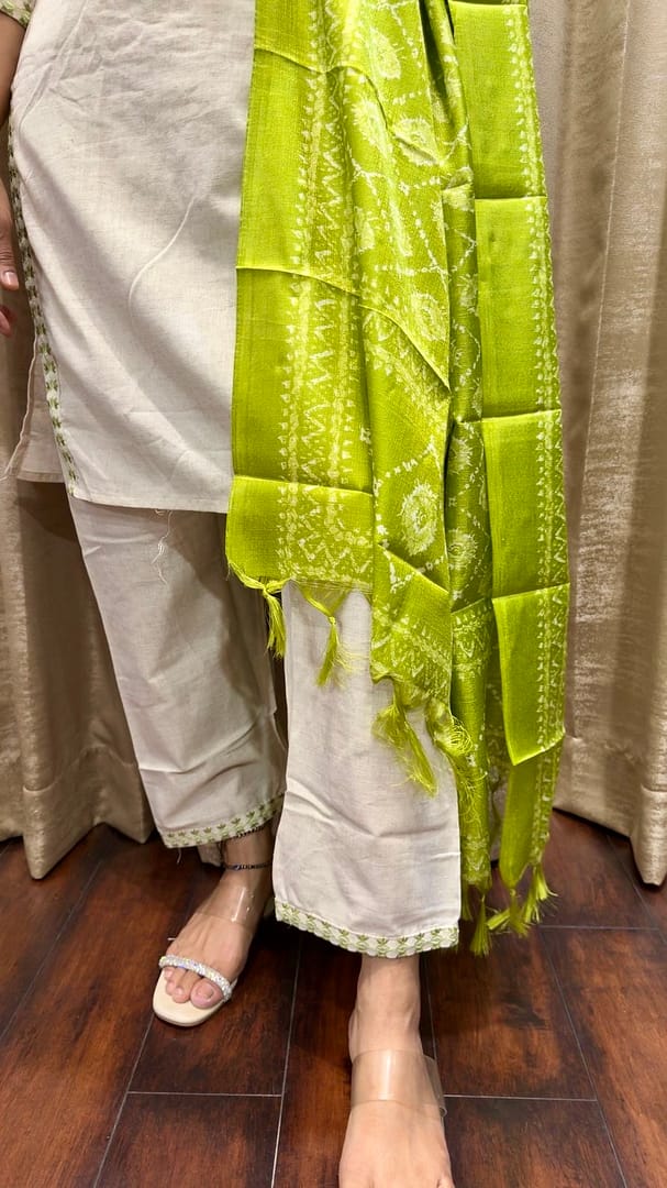 This is an elegant three-piece kurta set featuring a neutral-colored base and a contrasting dupatta.