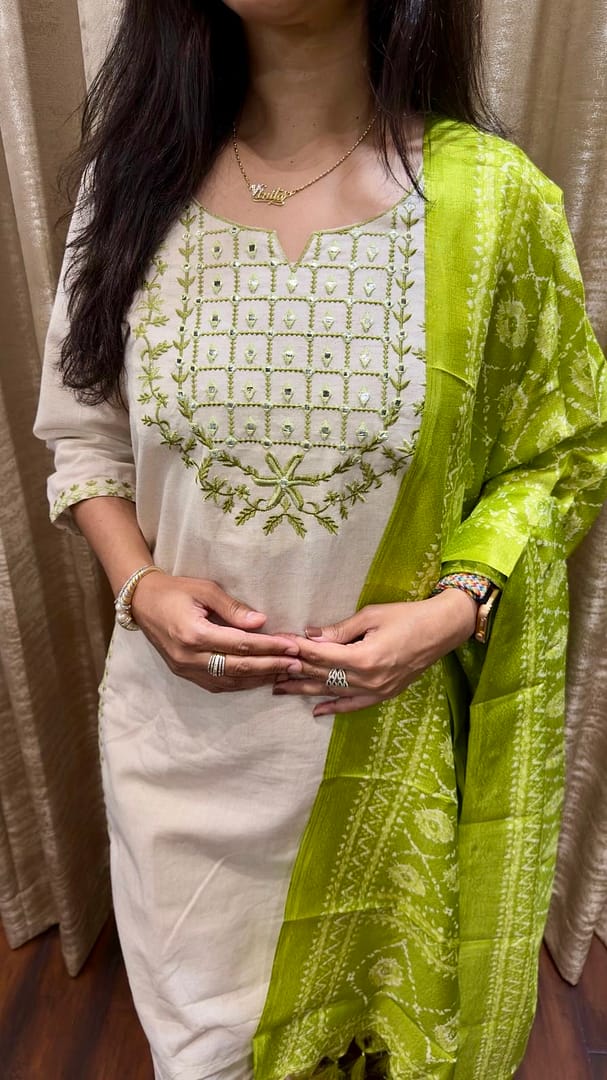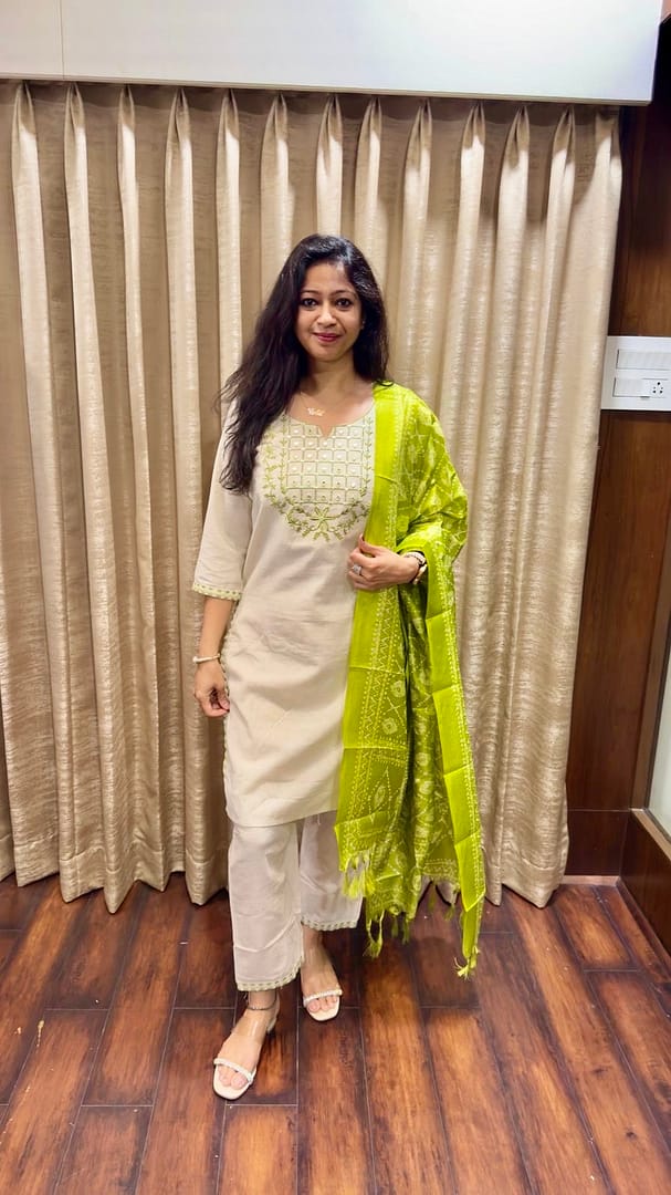 The main set is a cream likely in a silk-cotton blend,features intricate lime-colored embroidery concentrated around the yoke area in a traditional floral.It is paired with matching straight-fit trousers.