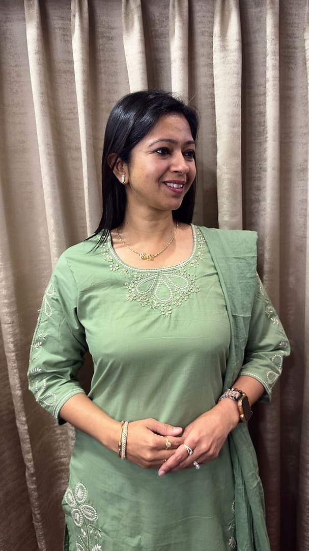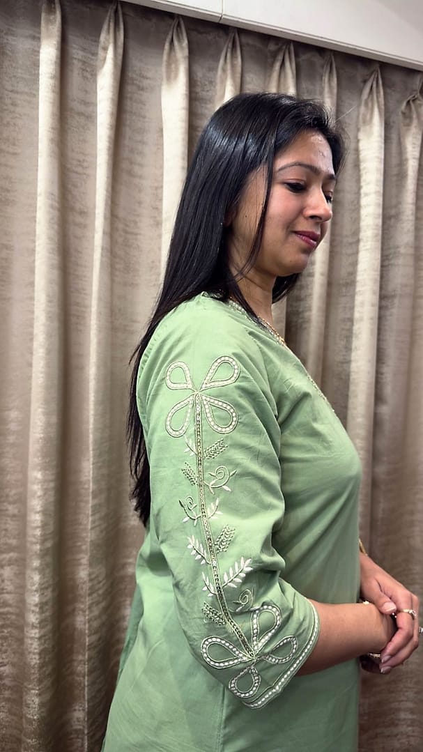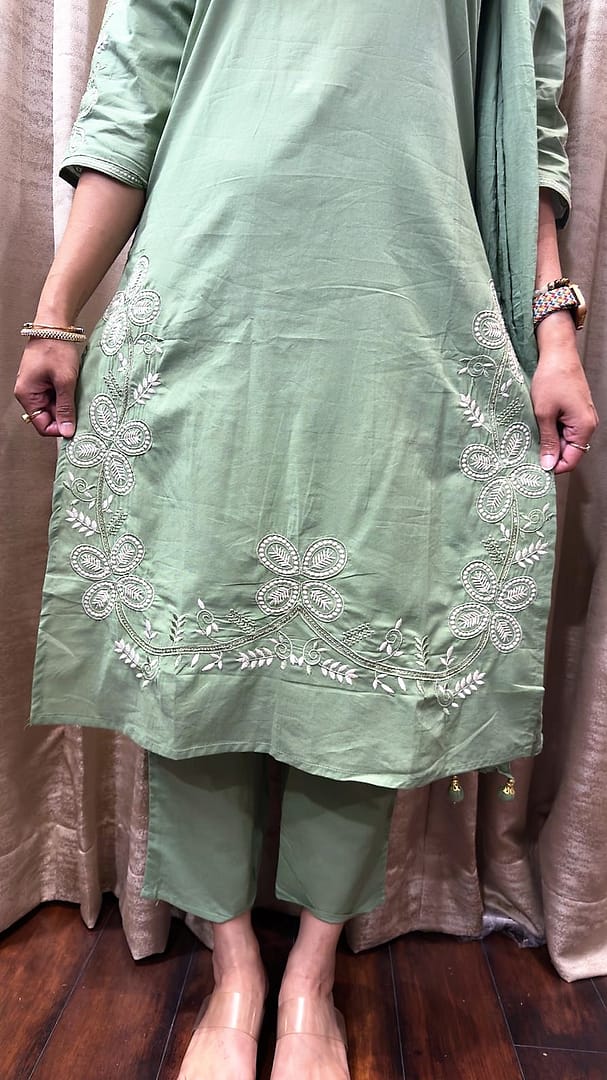 •A sage green kurta with a round neckline, featuring delicate white thread embroidery around the neck and bottom hem.