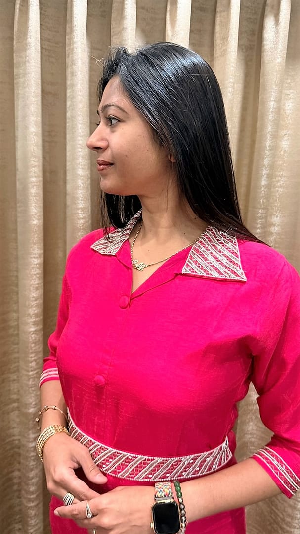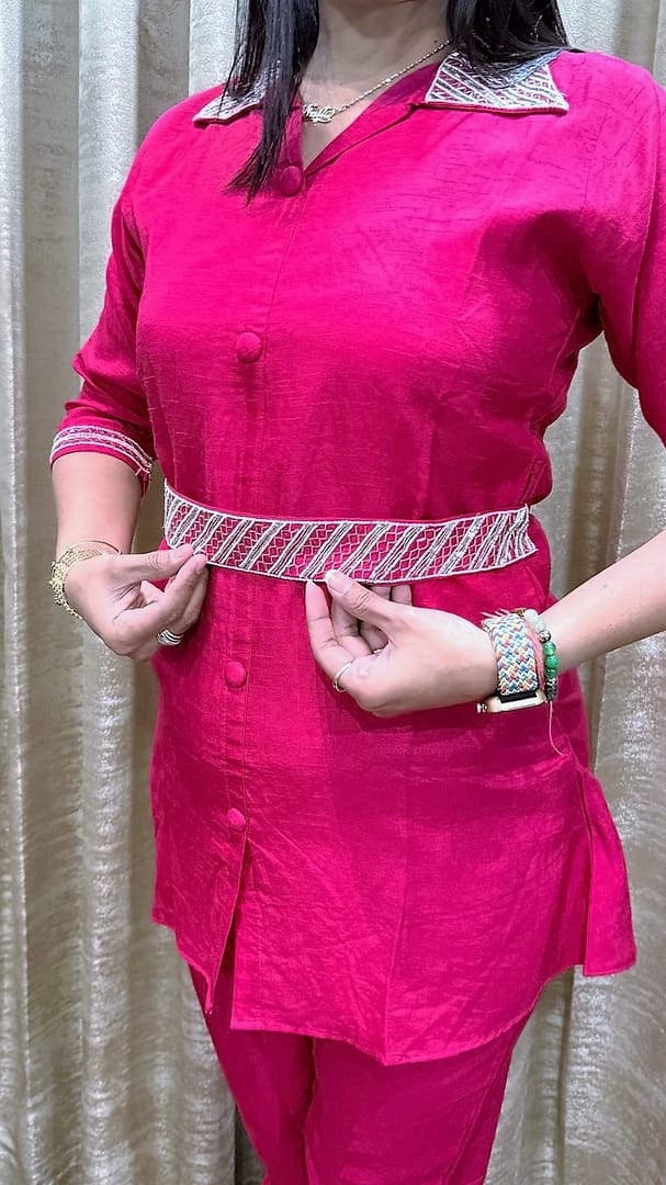 .A button-down, short-length tunic with a flared hem. It features a sharp collar and a wide, matching belted waistline, both decorated with white diagonal-stripe embroidery & work.