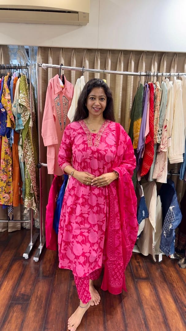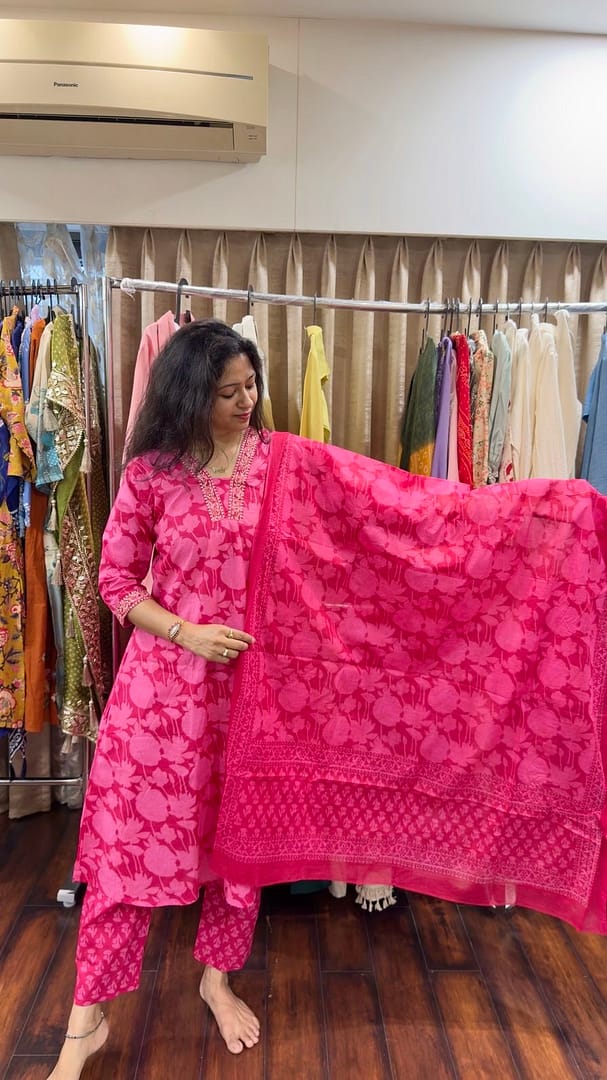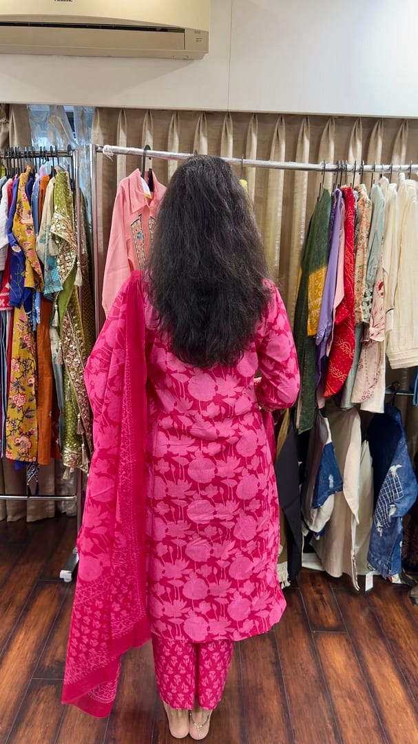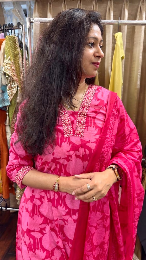 A vibrant hot pink cotton salwar kurta set featuring an all-over tonal floral print.