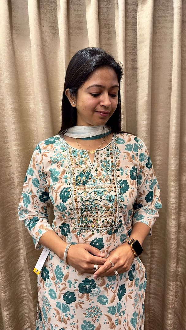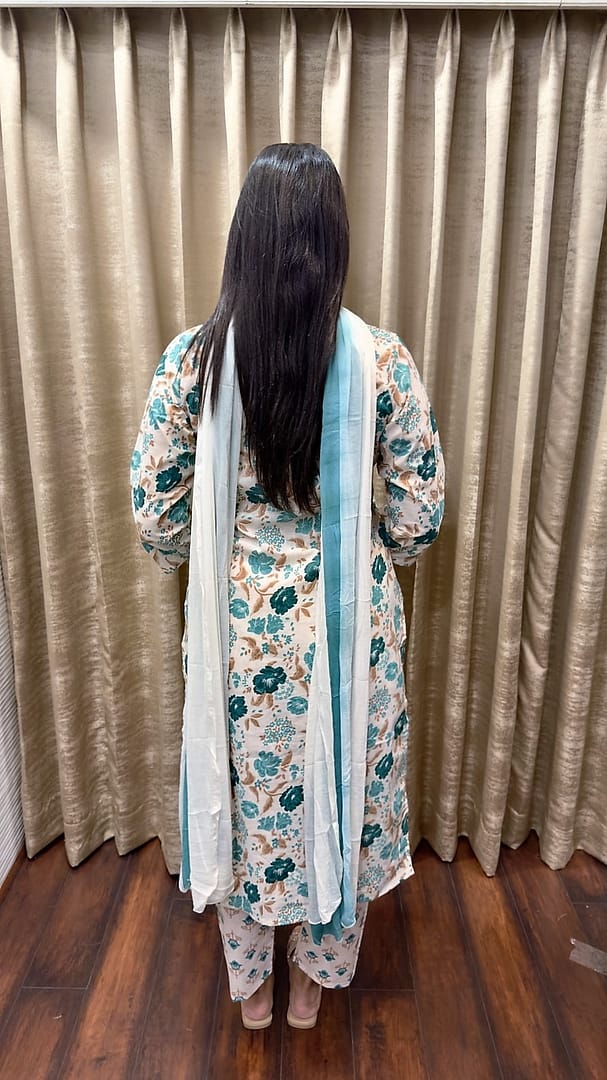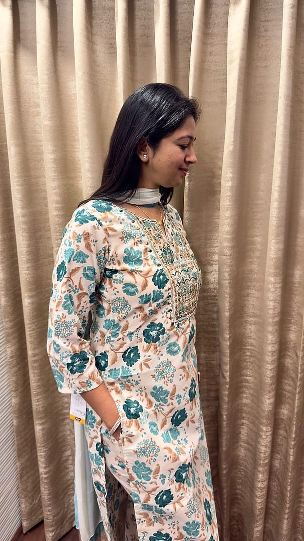 A crisp ivory straight-cut kurta blooming with vibrant teal and caramel floral prints.The neckline is highlighted by intricate mirror-work and embroidery adding a touch of traditional artisan detail paired with matching printed trousers and a delicate seafoam-blue dupatta this look perfectly balances everyday comfort with polished elegance.