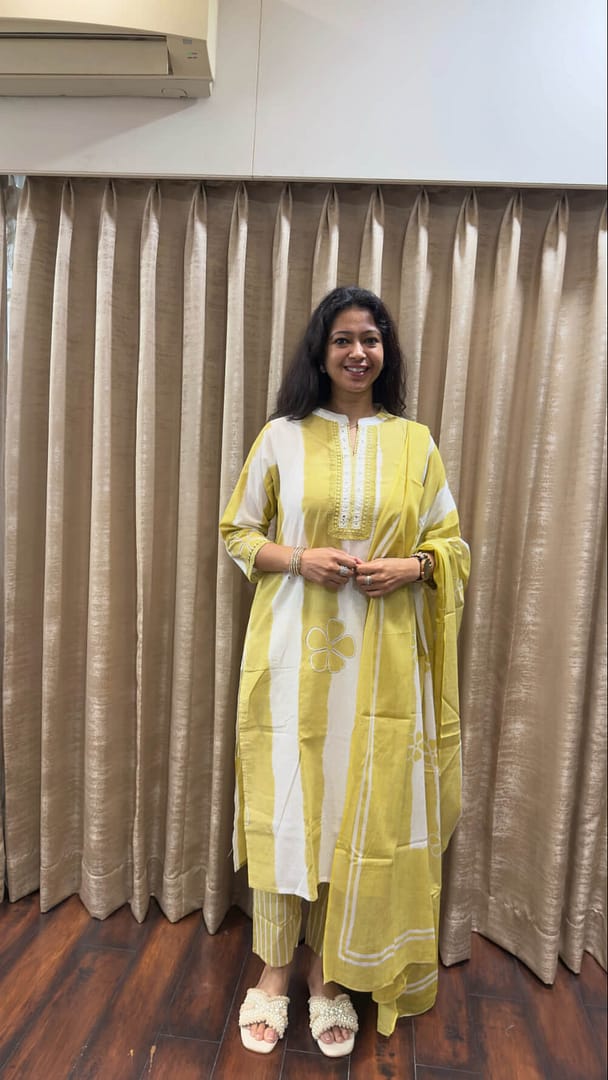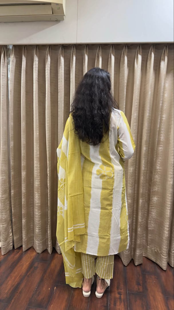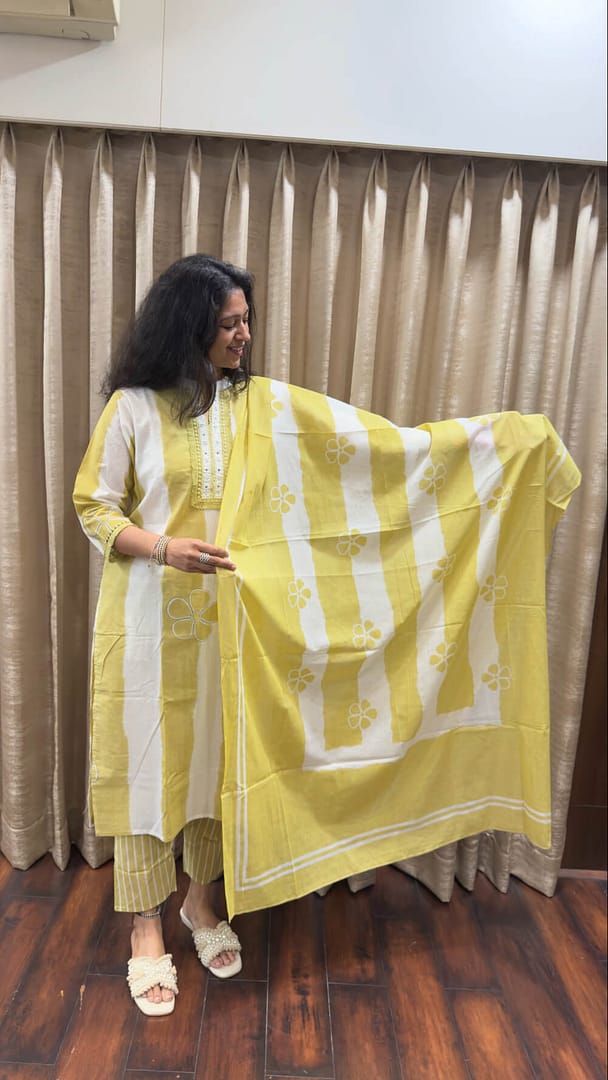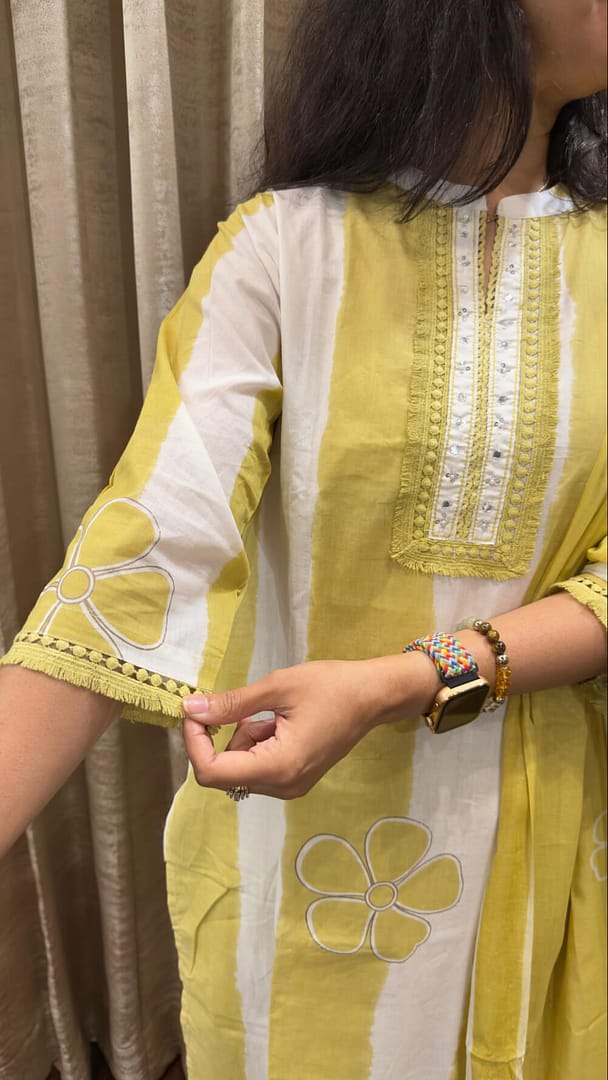 Light lemon soft bretheable cotton for everyday wear with slit delicate thread & mirror work placket.matching striped dupatta