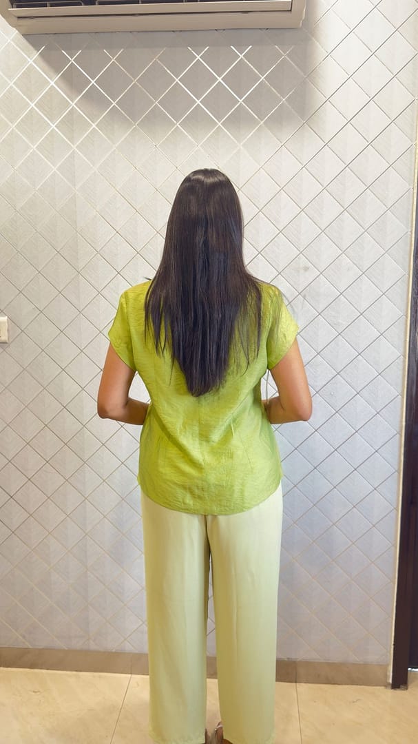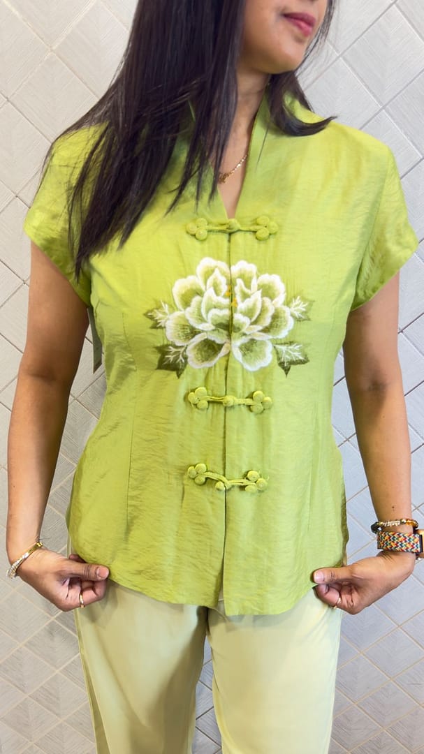 The top is a lime green shirt with a unique style,featuring a V-neck and traditional frog closures down the front.The chest is decorated with a beautiful,large white and pale green floral embroidery design. The set comes with comfortable,lighter lime green pants.
