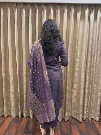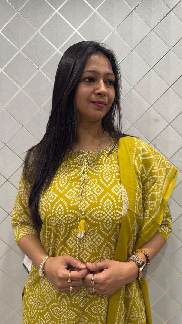 kurta,pant and dupatta features an all-over traditional Bandhani or block print pattern in white, which looks very intricate. The kurta has a simple neckline decorated with small, matching tassels.Chic look for daytime or casual outings.