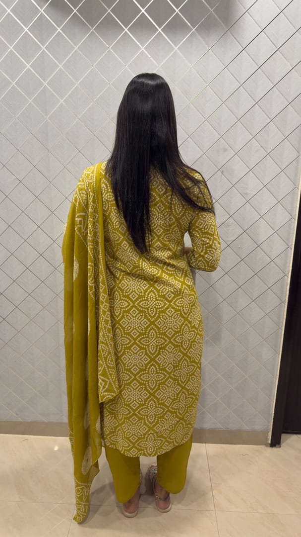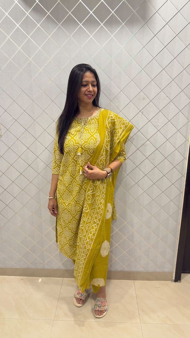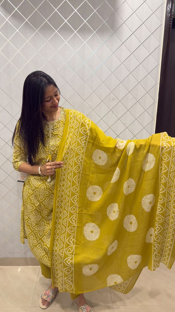 Three piece cotton suit in a fresh lime green color kurta,pant and dupatta features an all-over traditional Bandhani or block print pattern in white, which looks very intricate. The kurta has a simple neckline decorated with small, matching tassels.Chic look for daytime or casual outings.