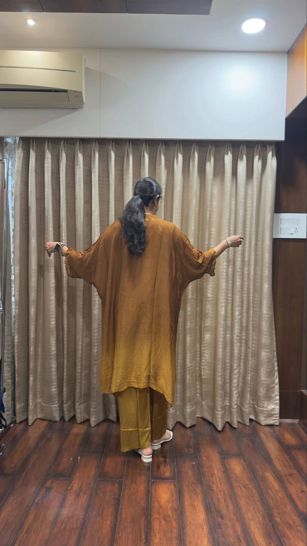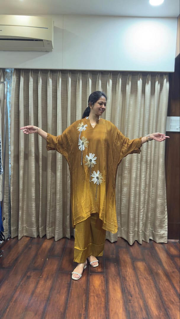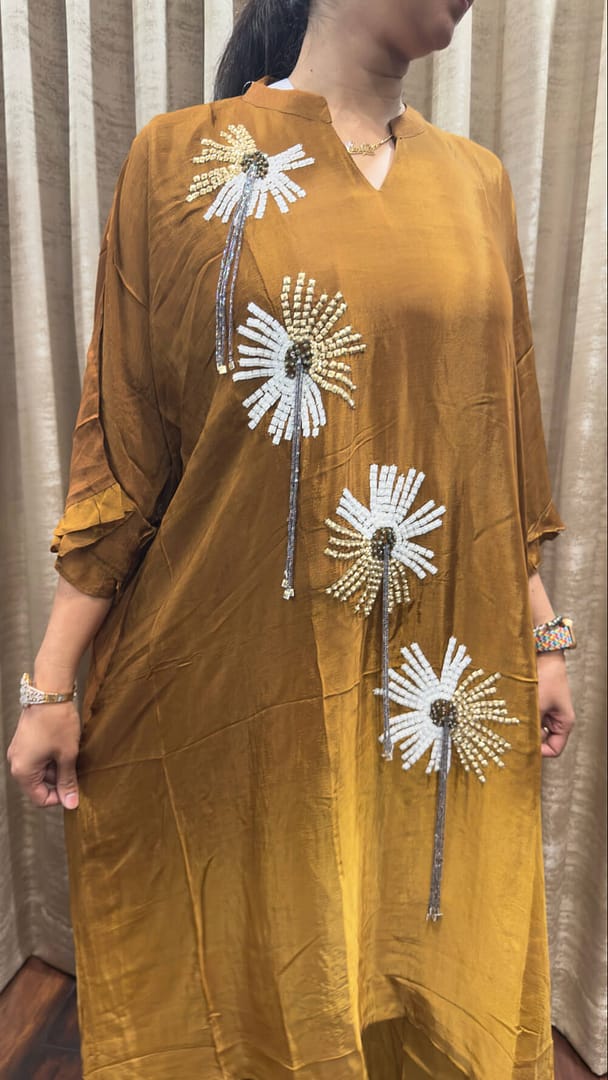 Mustard gold colored made a shiny,flowy fabric likely silk satin with embellishments abstract flowers made by bead & silver sequin tassels with matching fabric