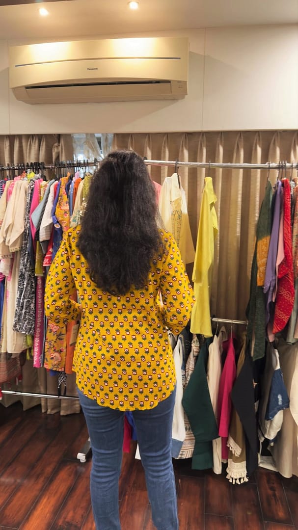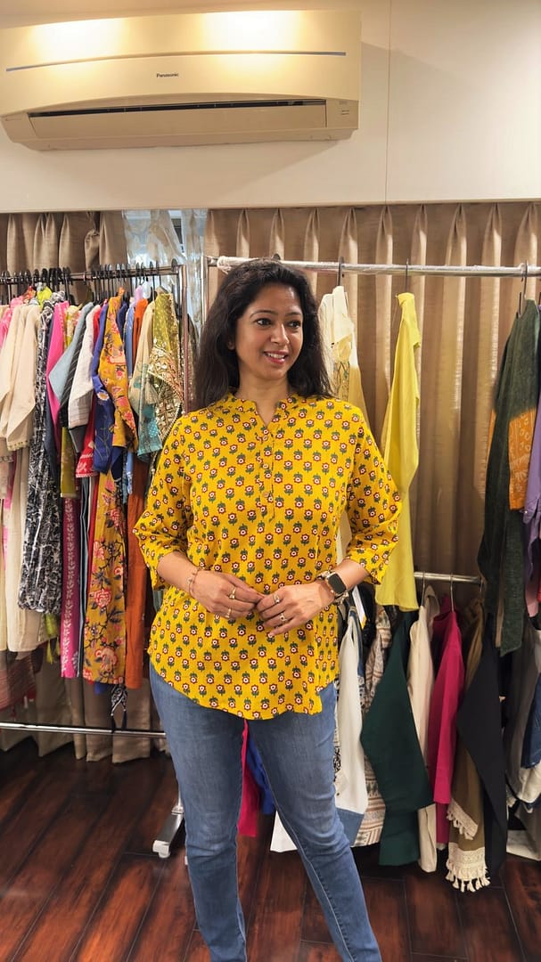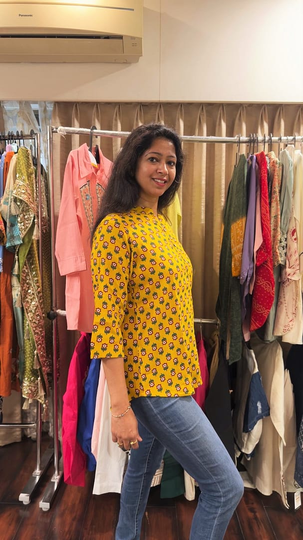 A mustard yellow tunic or short kurta with an intricate all-over small-scale print possibly block print in colors like black and red.