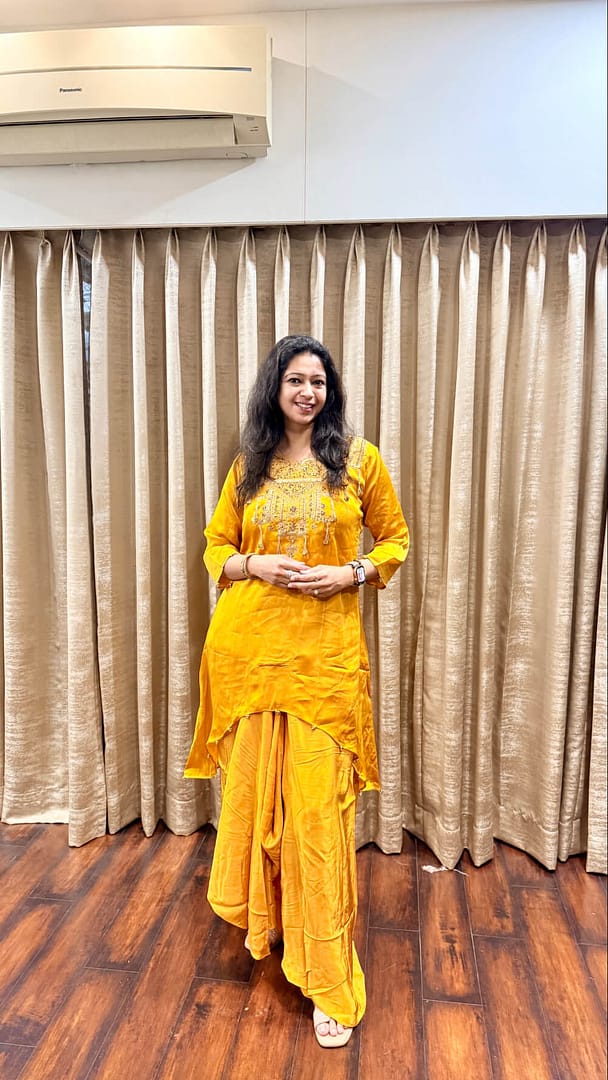 Mustard yellow blend soft silk Intricately block-printed yoke Subtle mirror work