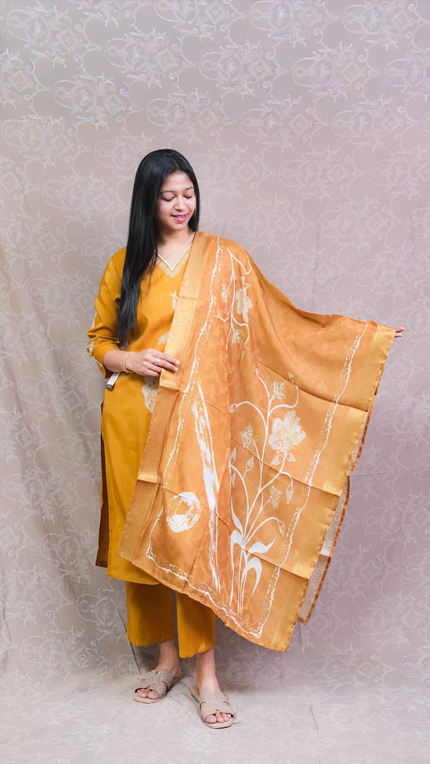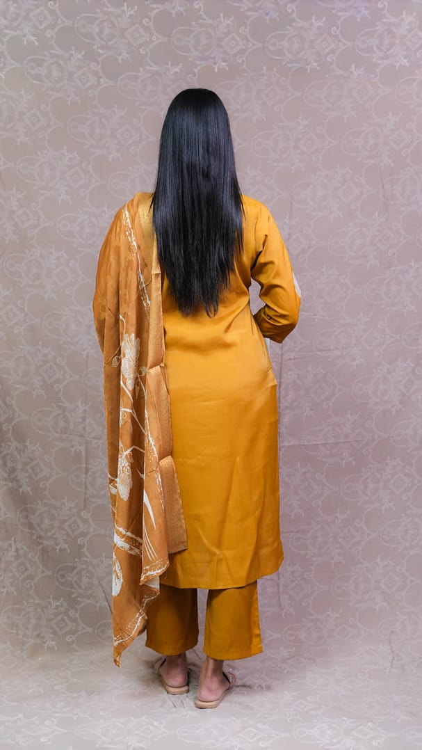 Brighten up your ethnic collection with this Mustard Yellow Full Suit. The vibrant mustard hue adds a cheerful and festive touch, while the elegant design ensures a graceful and polished look.
