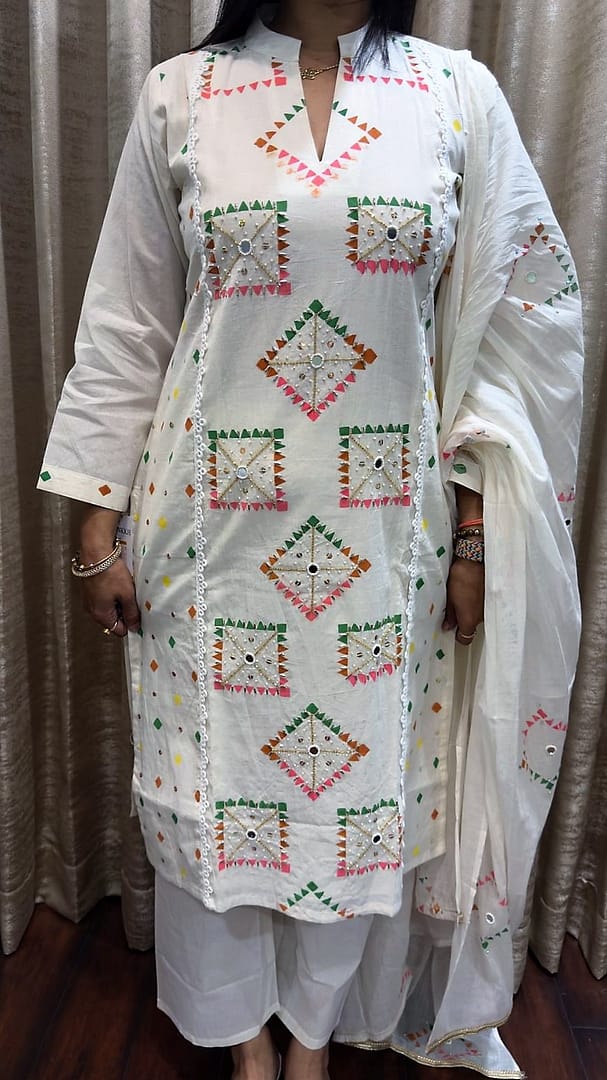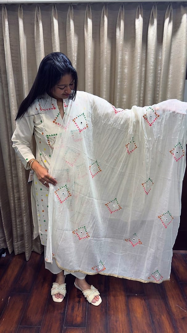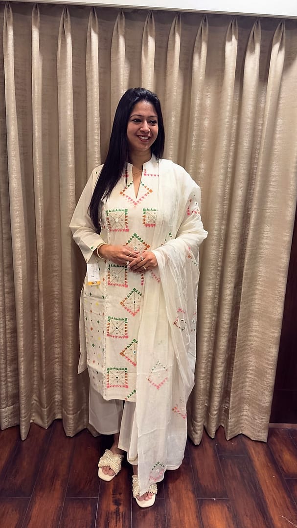 An off-white embroidered kurta set featuring vibrant geometric patterns and mirror-work details.•The straight kurta is decorated with colorful square motifs containing intricate threadwork and reflective mirror embellishments.• Neckline: It features a high mandarin collar with a small V-neck cutout.• Components: The ensemble is paired with matching off-white wide-leg trousers and a coordinated dupatta with matching colorful embroidery.