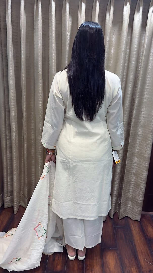 • Components: The ensemble is paired with matching off-white wide-leg trousers and a coordinated dupatta with matching colorful embroidery.