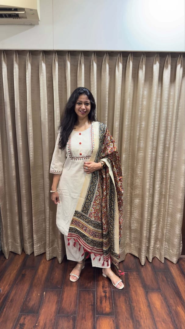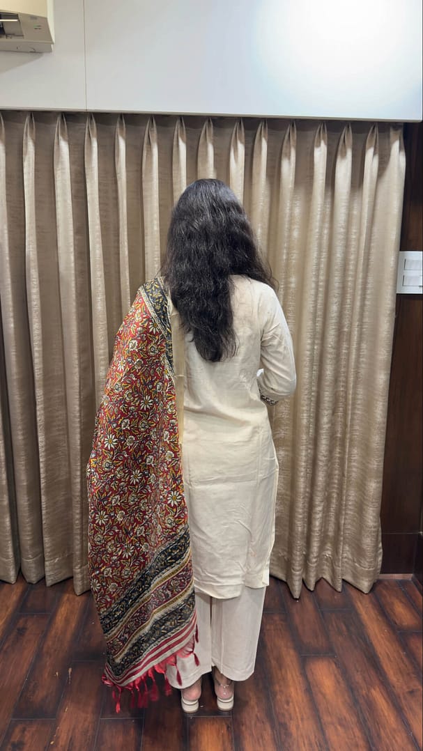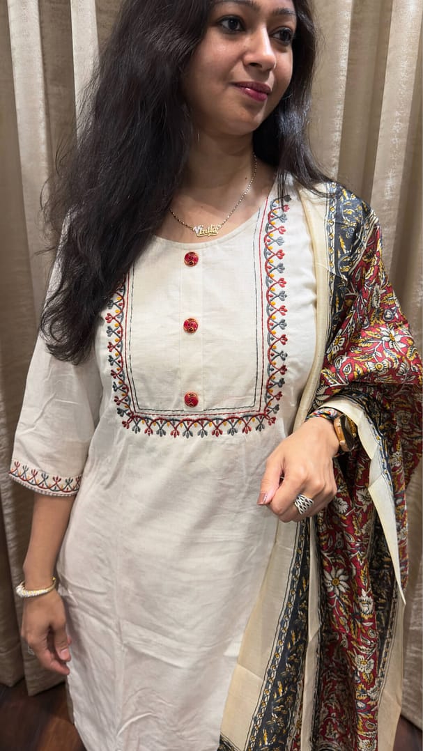 Comfort breathable slub cotton dupatta suit with embroidery on neckline & pant work on hemline colourful printed kalamkari dupatta