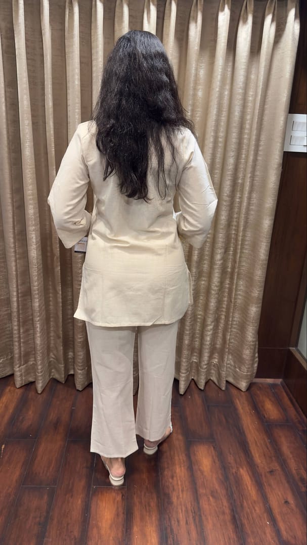 Contemporary two-piece coordinated set featuring an off-white/cream tunic and matching straight-leg pants.