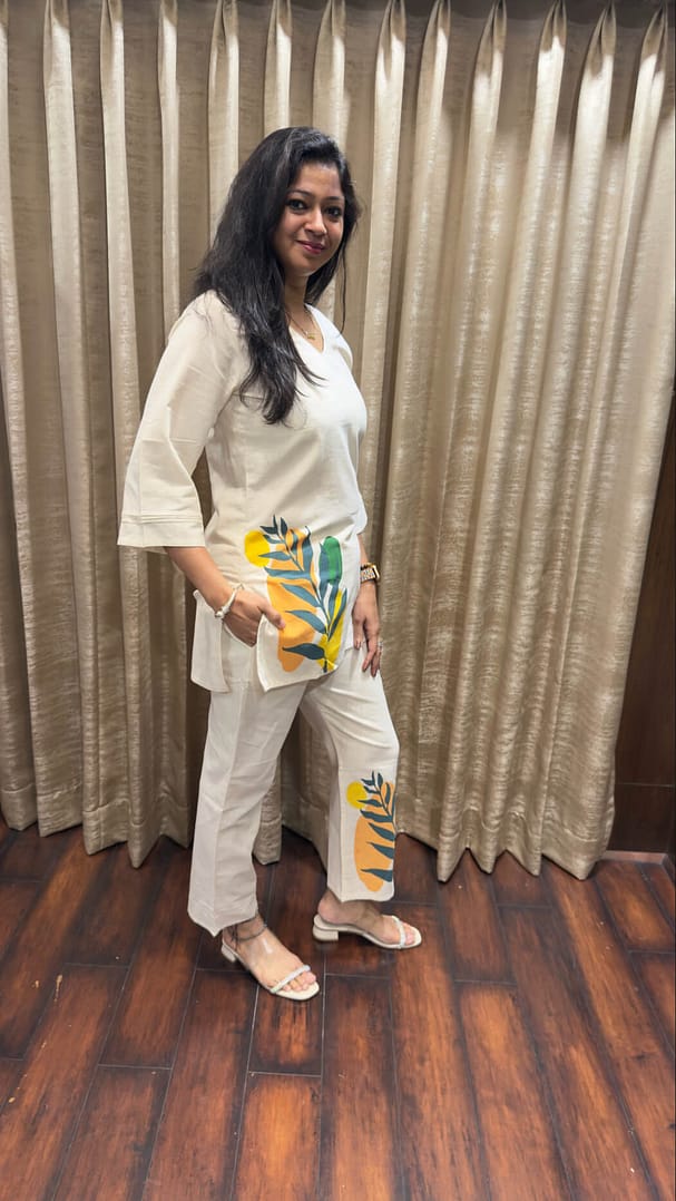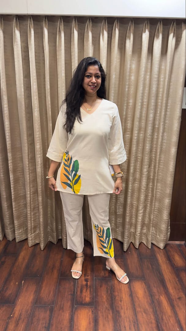 Contemporary two-piece coordinated set featuring an off-white/cream tunic and matching straight-leg pants.hand-painted printed leaf motifs in shades of yellow, orange& green