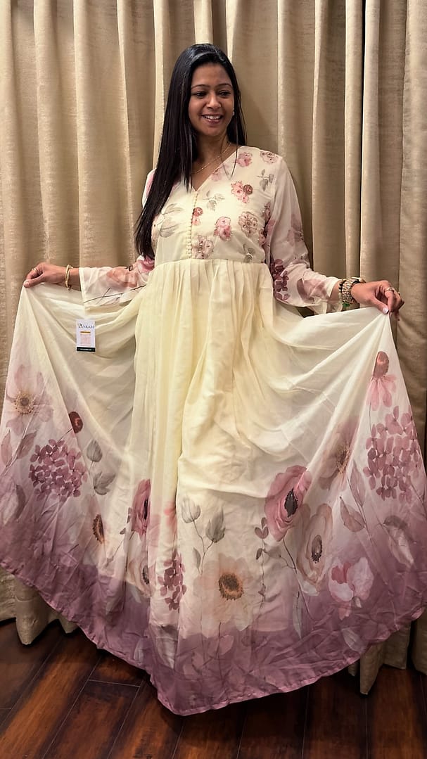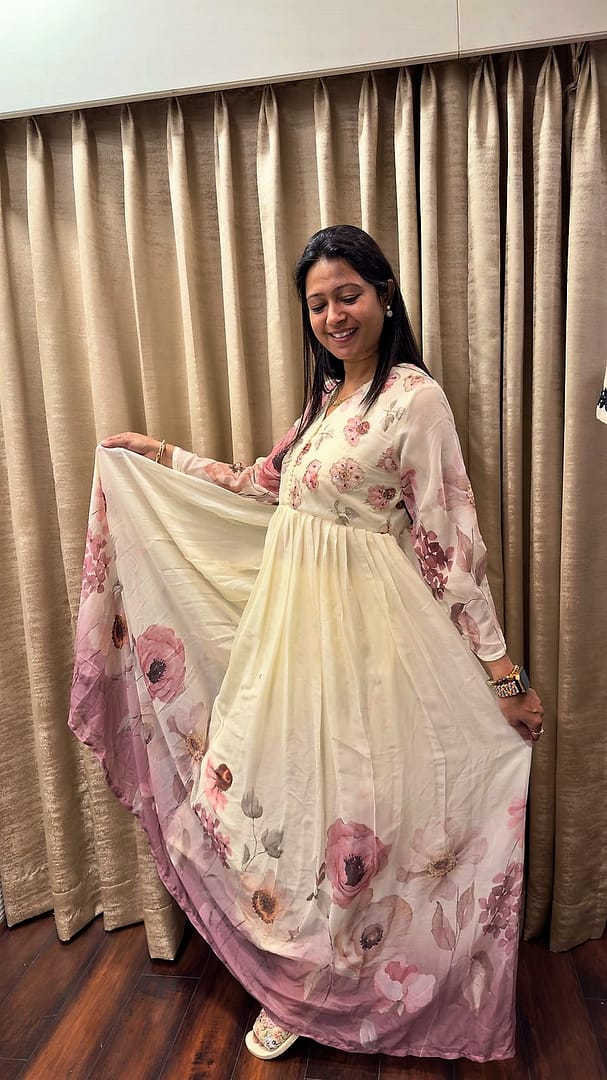 The base of the dress is a soft cream featuring a romantic floral print in shades of dusty rose, mauve, and taupe.