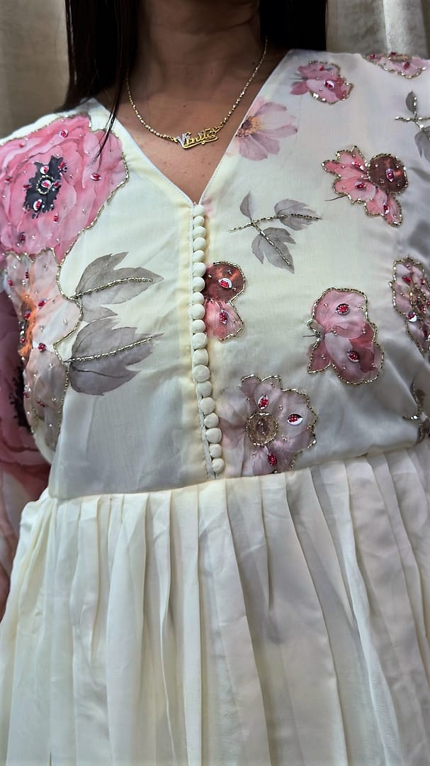 • Bodice & Silhouette: The dress has a V-neckline adorned with delicate button detailing down the center. It features an empire waistline with soft gathering that transitions into a voluminous,flared skirt.