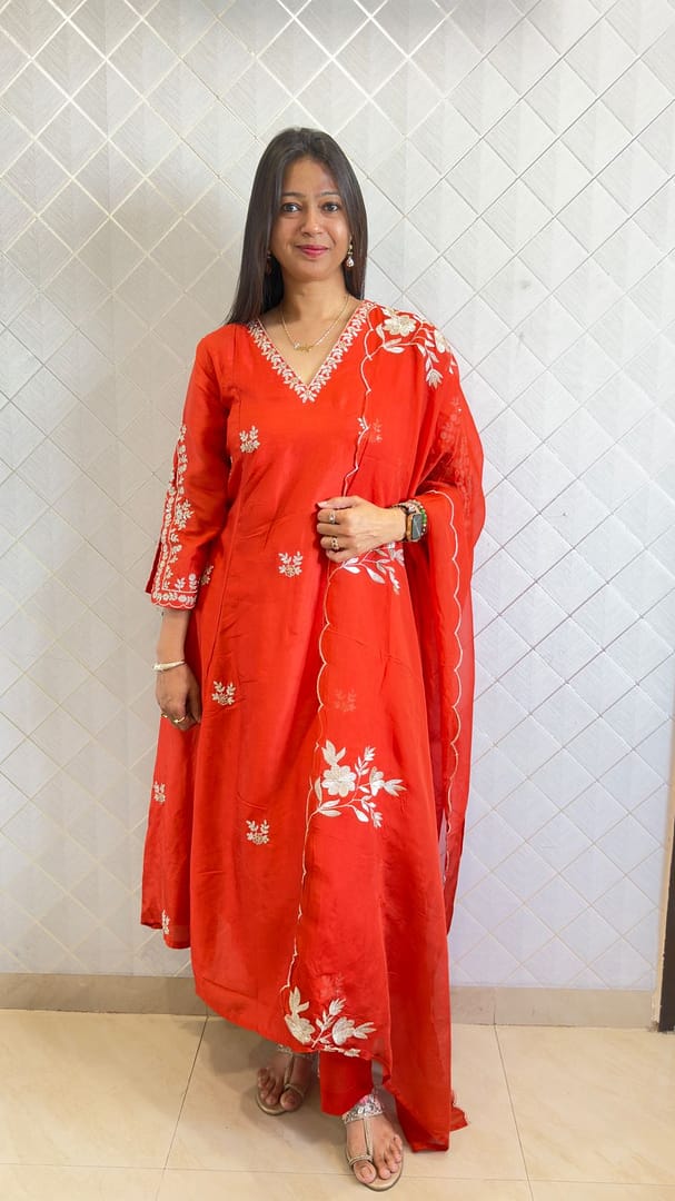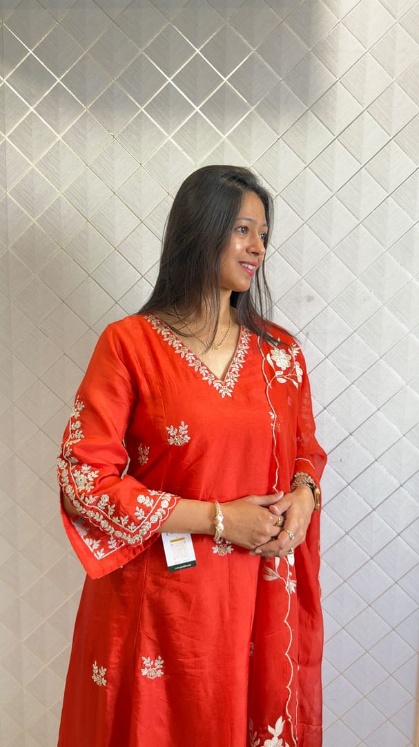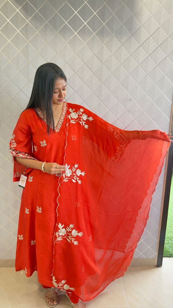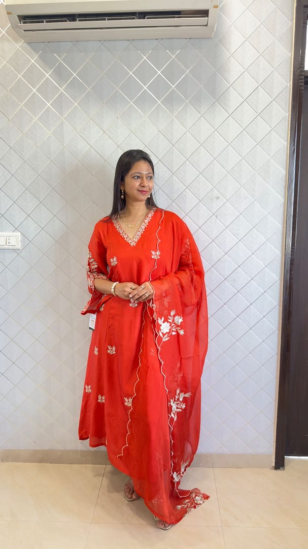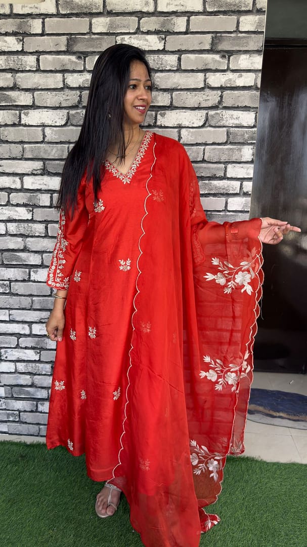 This vibrant scarlet Anarkali suit set is crafted from luxurious fabric, featuring a beautifully flared kurta and matching dupatta. The ensemble is adorned with intricate white thread & beads handwork along the neckline, sleeves, and scattered throughout the fabric, contrasting beautifully with the rich red hue. Perfect for festive occasions and formal gatherings.