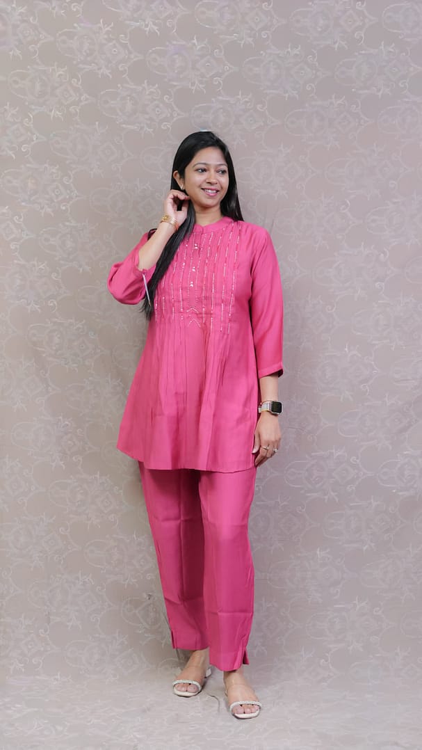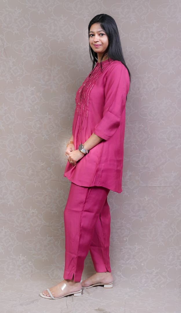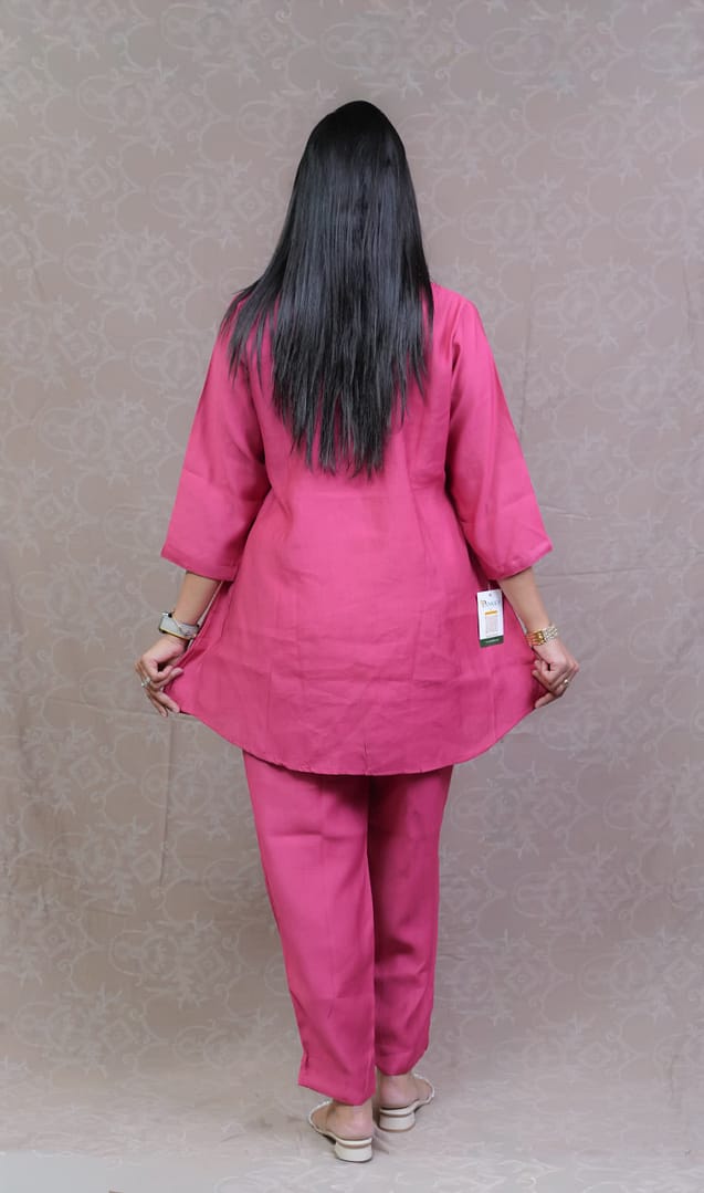 Add a playful yet elegant touch to your wardrobe with this Pink Pintest Co-Ord Set. Featuring a soft pink base with stylish pintest detailing, this set offers a fresh and trendy look perfect for modern styling.