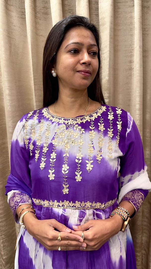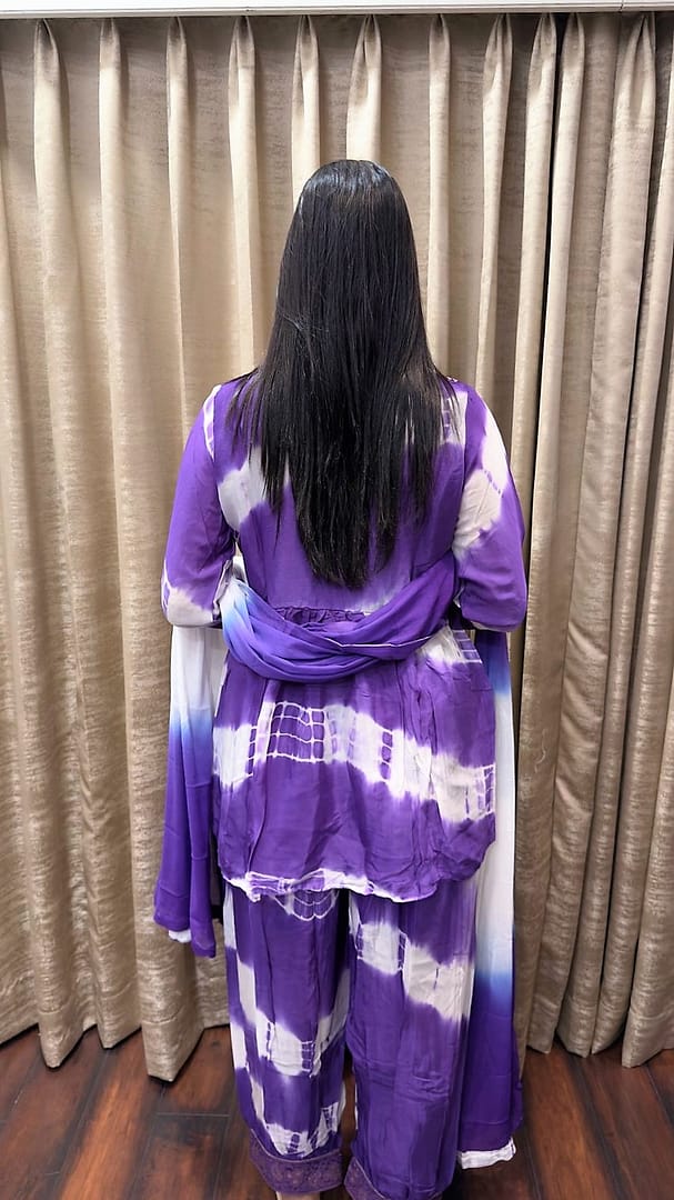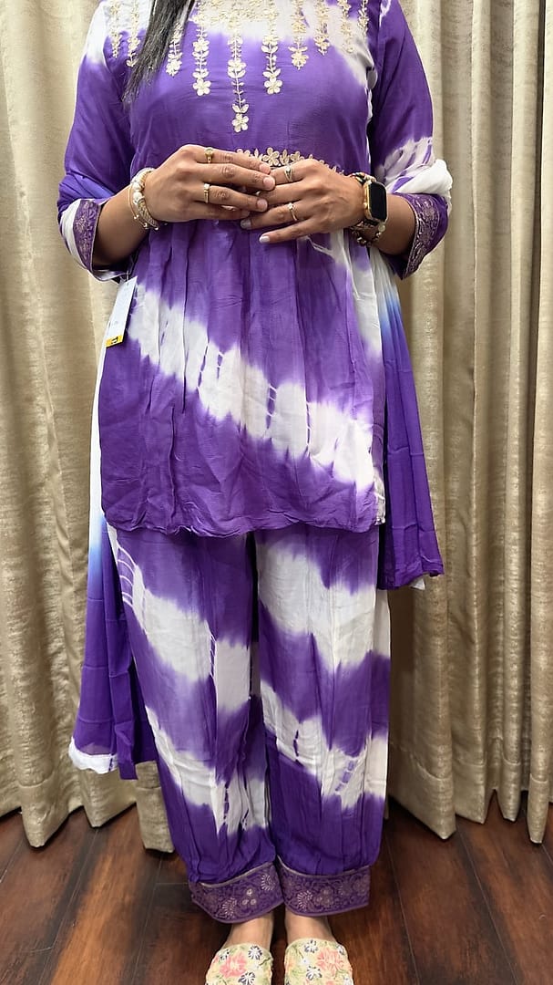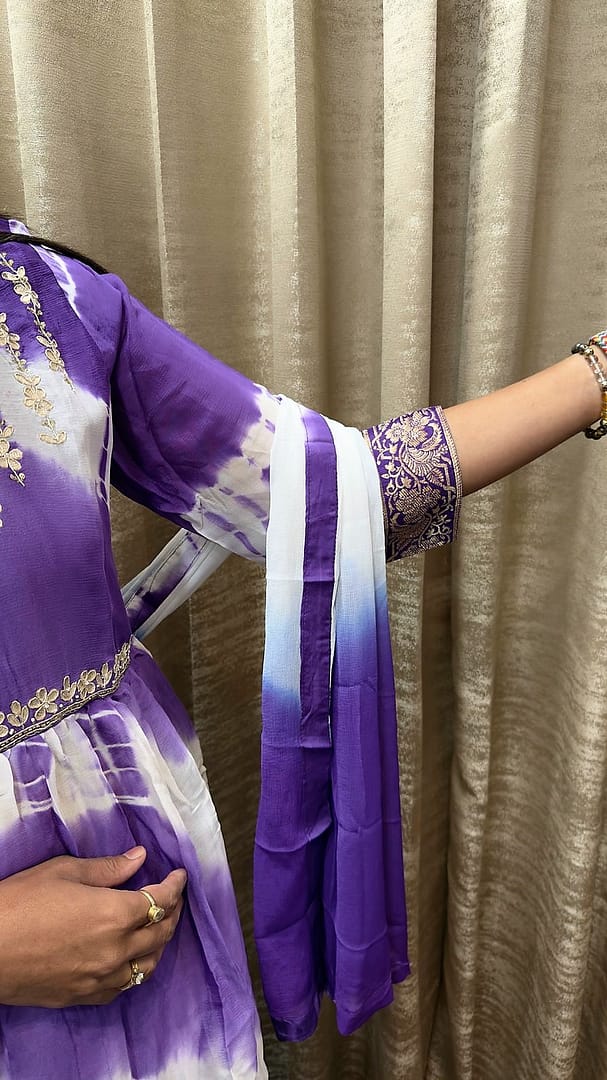 • Bottoms: Matching tie-dye dhoti-style pants or loose trousers with embroidered borders at the ankles with pure chiffon dupatta.