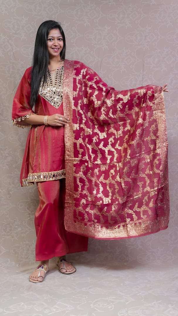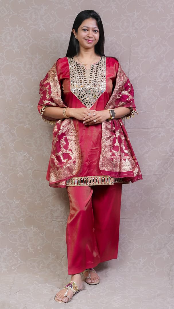 Make a bold and elegant statement with this stunning Red Shimmer Ethnic Full Suit. Designed to add a touch of glamour to your festive wardrobe, the subtle shimmer finish enhances its rich red tone, giving you a radiant and graceful look.