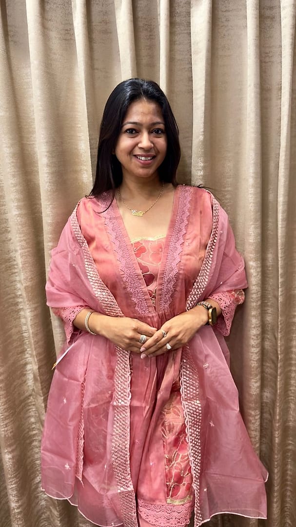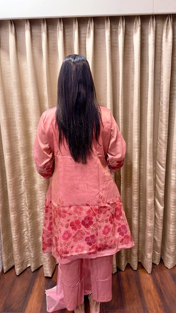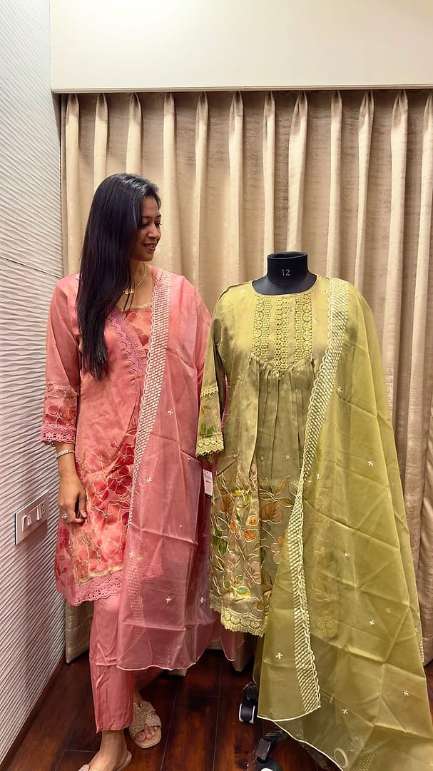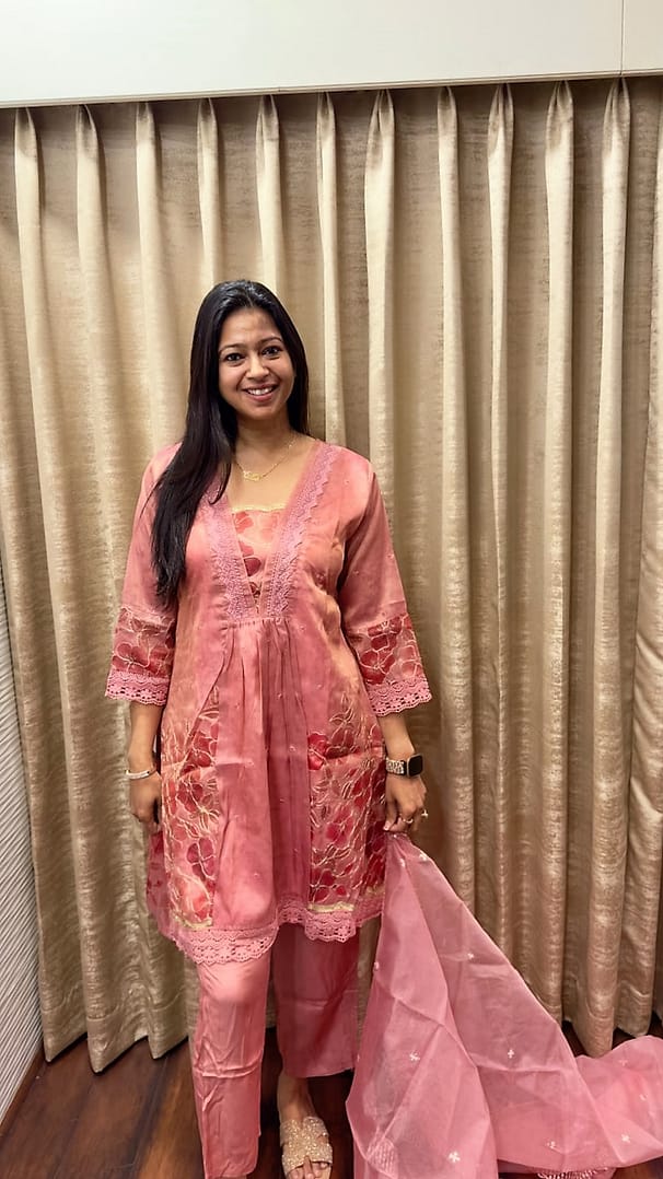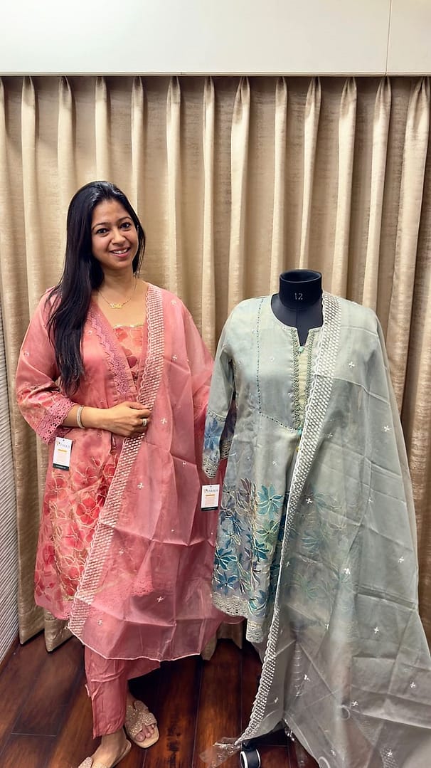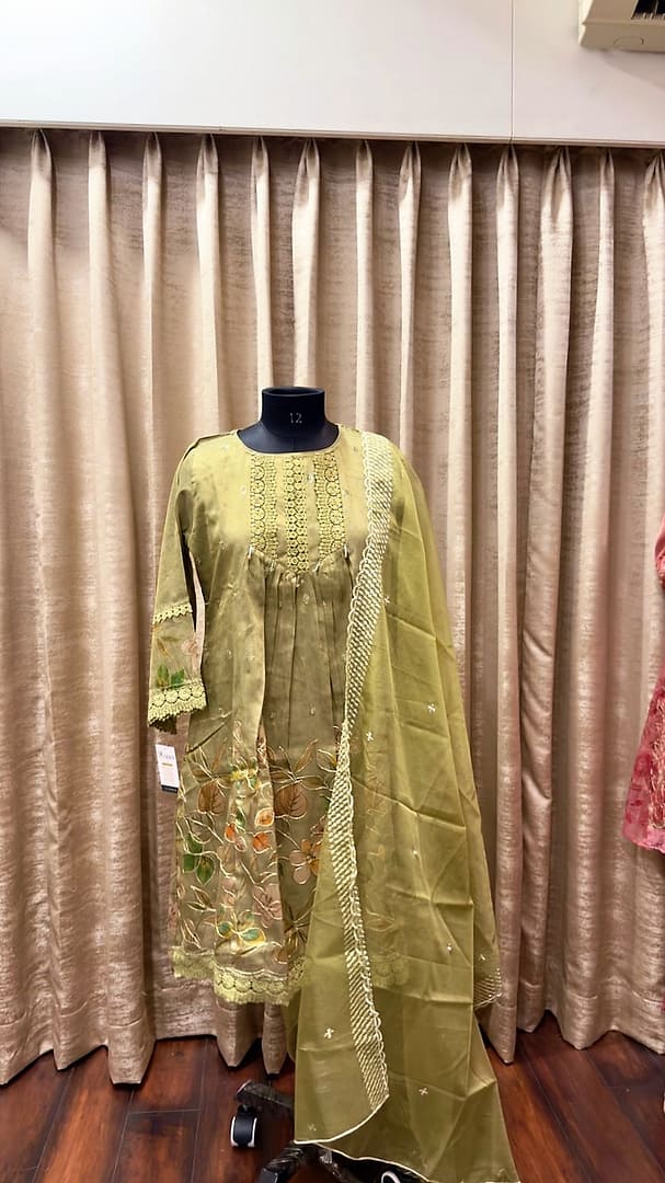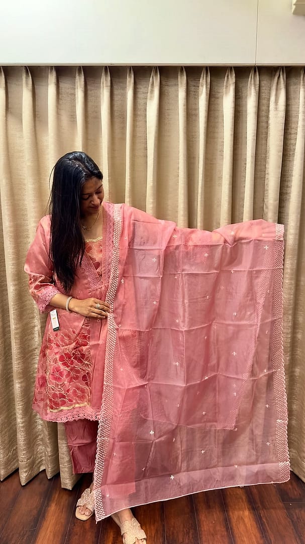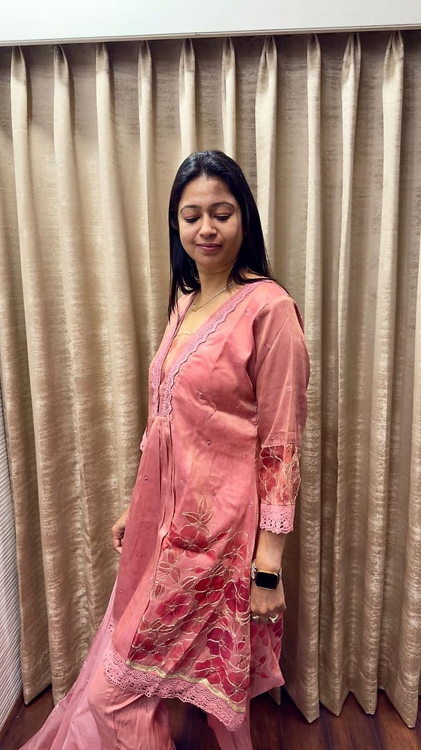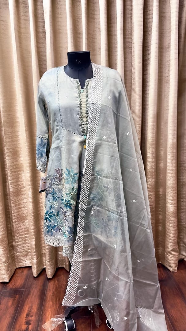 A soft ROSE PINK/GREEN/GREY TUNIC adorned with delicate floral embroidery and intricate lace detailing.It is paired with a matching sheer organza dupatta finished with a scalloped lace border and subtle crystalline motifs.The lightweight shimmering fabric and tonal palette create a look of timeless femininity and understated luxury.