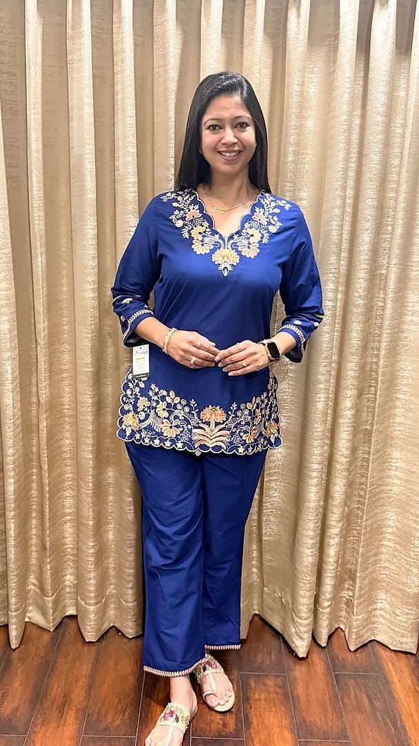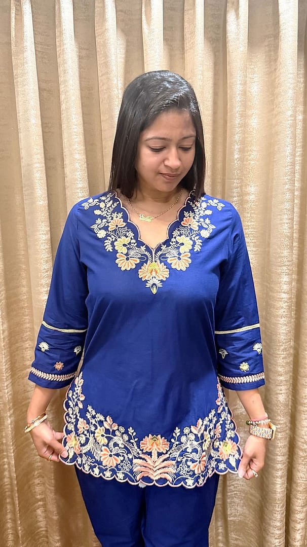 A vibrant royal blue ethnic co-ord set with delicate floral embroidery