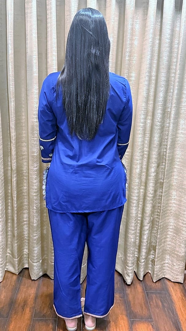 • The Pants: Matching royal blue trousers in a comfortable, straight-leg fit with a subtle decorative border at the ankles.