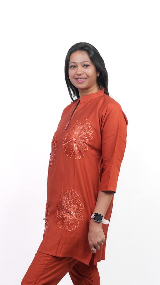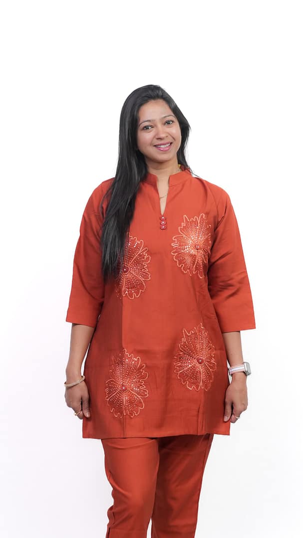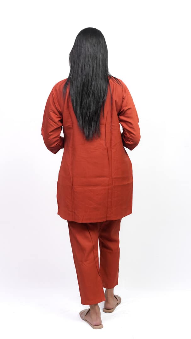 A perfect blend of elegance and comfort, this Rust Flower Thread Work Co-ord Set features intricate floral embroidery on a rich rust base—ideal for a refined, stylish look.
