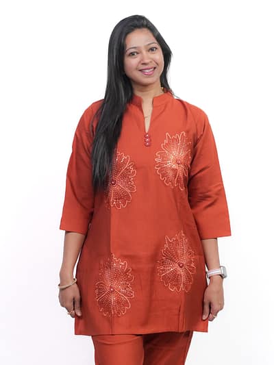 A perfect blend of elegance and comfort, this Rust Flower Thread Work Co-ord Set features intricate floral embroidery on a rich rust base—ideal for a refined, stylish look.
