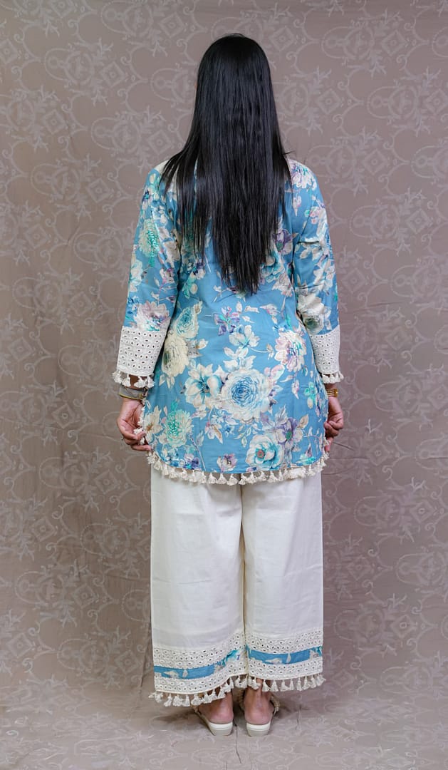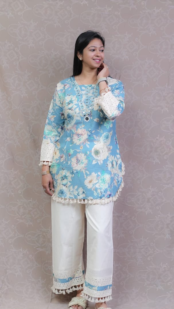 Embrace a relaxed and stylish vibe with this Sky Blue Boho Design Co-Ord Set. Featuring playful boho patterns in a soothing sky blue shade, this set is perfect for casual outings, brunches, or vacation days.